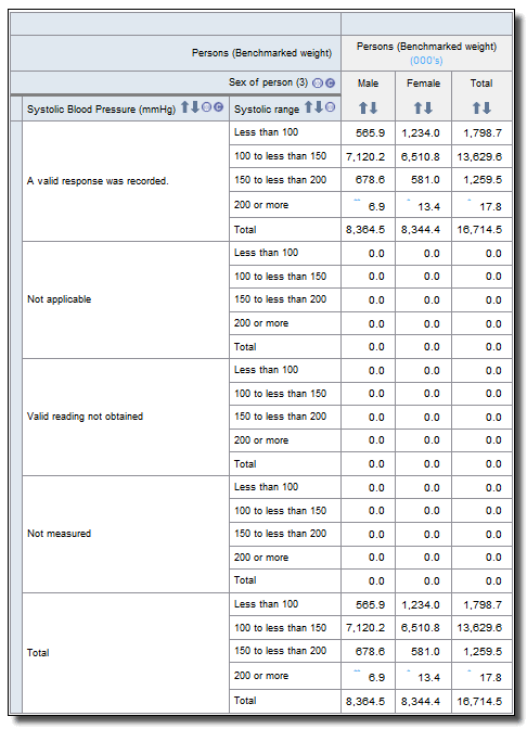 *Note: Biomedical persons (Benchmarked weight) must be used to produce population estimates of persons 5 years and over with specified biomedical characteristics, rather than Persons (Benchmarked weight). The Biomedical persons (Benchmarked weight) applies a weight of 0 to children under 5 years and biomedical non-participants, ensuring that they do not contribute to the population estimate. For example, a table of reported fasting status using the 'Persons (Benchmarked weight)' will show the fasting status for the entire NHS survey. Note that the 'Not applicable' persons include those people who did not participate in the NHMS and those persons aged 5 to 11 years who participated in the NHMS but were only required to provide a urine sample. The population for the following table represents the entire Australian population. The same table using the 'Biomedical persons (Benchmarked weight)' will show the fasting status for only persons who participated in the NHMS. Note that in this case, 'Not applicable' persons are those people aged 5 to 11 years who participated in the NHMS but were only required to provide a urine sample. People who did not participate in the biomedical component do not have a biomedical person weight and therefore do not contribute to the table when this weight is used. The biomedical population now presents weighted estimates for the Australian population aged 5 years and over. MEANS AND MEDIANS Means and medians of continuous data items are calculated at the level of the continuous data item and therefore use the weight at that level. Due to current functionality of the software, a weight from another level cannot be brought into such calculations. The "subject" of the means and medians calculated in TableBuilder is therefore the statistical unit associated with the level of the database on which the continuous data item is stored. For example, the mean of the "Mls of pure alcohol consumed by day" data item at the Alcohol Day level would give the mean total volume of pure alcohol per day, while the mean of "Mls of pure alcohol consumed by type of drink" data item at the Alcohol Type level would be the mean total mls of pure alcohol per alcohol type (or per alcohol type by day if desired). ITEMS LOCATED ON MULTIPLE LEVELS Where items are available on more than one level, an additional number is added to the label to indicate the level version. For example a (1) indicates it's a Household level version, a (2) indicates a Persons in household level version, a (3) indicates a Person level version, and so on. These are identified in the Data item list labelling as well as for the item in TableBuilder. The numbering is based on the ordering of levels found in the File Structure page of this product. Care should be used to ensure the correct version of the item is used, particularly with regards to demographic items located on both the Persons in household and Person levels. See below for more details. PERSONS IN HOUSEHOLD VS PERSON DATA ITEMS The Persons in Household level contains data for every person in the household while the Persons level only contains data for the selected persons. Both levels are children of the Household level - that is, they are siblings and are not linked by person but by household. This means that there is a many-to-many link between records at these levels (persons on the Person level are linked to all the people in their household on the Persons in household level). The Persons in Household level is available in order to produce compositional information about the household (e.g. Whether there are persons in the household aged 4-14 years) which can then either be used with the household weight to represent for example, the number of households which contain persons aged 4-14 years, or with the person weight to represent the number of people living in a household that contain persons aged 4-14 years. When summing the Persons (Benchmarked weight) (which is stored at the Person level), the meaning of the estimates produced when disaggregating by another data item at the Person level will not be the same as the meaning of the estimates produced when disaggregating by a data item at the Persons in Household level. For example, disaggregating by Sex of person (3) and Registered marital status (3) from the Person level will produce estimates of the "Number of persons who are Male and Married". These estimates will be additive (aside from the effects of perturbation) as shown below: On the other hand, disaggregating by Sex of person (2) and Registered marital status (2) from the Persons in Household level, and using the Persons (Benchmarked weight) from the Person level, will produce estimates of the type "Number of persons living in households containing one or more persons who are Male and Married". These estimates will usually not be additive as shown below; CODING ISSUES Issues have been identified with the coding of the 2011-12 data for the conditions 'Back pain/problem, disc disorder', 'Diseases of the digestive system', 'Symptoms, signs and conditions not elsewhere classified', 'Rheumatism' and 'Other diseases of the musculoskeletal system and connective tissue'. Analysis indicates that at the national level: