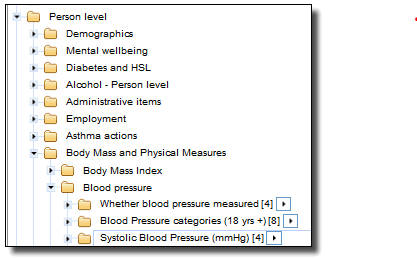 Using Weights The NHS is a sample survey. To produce estimates for the in-scope population you must use weight fields in your tables. In TableBuilder they can be found under the Summation Options category in the left hand pane under the applicable level. If you do not select a weight field, TableBuilder will apply 'Persons (Benchmarked weight)' by default. This will give you estimates of the number of persons. To produce estimates of the number of households you would have to add Households (Benchmarked weight) from the Household level to your table. To produce estimates for NHS selected persons who participated in the National Health Measures Survey (NHMS), the Biomedical persons (Benchmarked weight) located on the Biomedical level must be used. Note that when dealing with the functions of means, medians, and sums, a weight is automatically applied from a weight allocated behind the scenes to the level of the variable (for all levels, other than Persons in household, a person weight has been applied to each record (e.g. alcohol record) on the level based on the weight allocated to selected persons on the Person level. For Persons in household, the household weight has been applied to each person in the household). These weights are not visible but are referenced in the 'Weighted by' statement with continuous variables, as per: For more details, see Means and Medians below: When using a Weight/Summation from a level that is different to that of the variables in the table, please be careful in interpreting the results.