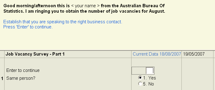 Layout Horizontal and vertical layouts Default horizontal layout This is the default Blaise layout and is the standard format used for household survey CAI instruments. A horizontal line separates the Information Pane and the Form Pane (see Diagram 5). One question appears on the screen at a time in the information pane. This layout is suitable for surveys which have many yes/no answers, multiple choice pick-lists, and automatic sequencing. Diagram 5. Horizontal screen layout Alternative horizontal layout For horizontal layouts that require historical data to be displayed in columns, the alternative horizontal layout is suitable. The form pane (rather than the information pane) contains the answer choices (see Diagram 6). Diagram 6: Alternative horizontal layout for CATIs displaying historical data Vertical layout In this layout, the questions are on the left of the screen and the answer fields are on the right, allowing more than one question to appear on the screen at a time (see Diagram 7). The vertical layout is not suitable for forms that have a large amount of sequencing as skipped questions cannot be 'hidden'. The questions should be visible without scrolling. Diagram 7. Vertical screen layout The screen layout should be as simple and uncluttered as possible. There should be top and left margins of about 5mm in the information pane and form pane. Back to top Screen colours For CATIs using the horizontal layout, the standard is pale yellow for the information pane background and light grey for the field pane. For the vertical layout, the current standard is for all parts of the screen to be light grey. Questions and responses If there is a self-administered form which the respondent is referring to, there should be question numbers in the CAI instrument which match the question numbers used in the paper form. If the CAI instrument requires additional questions that are not on the paper form, the extra questions should be given an alphanumeric identifier (e.g. two additional questions between questions 5 and 6 would be labelled 5a and 5b). Below the instructions should be an indicator relating to other notes or help which may be available. The lines of question text should be about 60 characters wide, leaving some blank space to the right. There may also be completion instructions for the interviewer. All of this information needs to fit on one screen. The interviewer should never have to scroll the information pane to see everything. When the whole question will not fit it should be split somehow or use a pop-up. Form pane fields should have a short label which is meaningful enough to recognise the question it belongs to. Diagram 8. Labels for response fields in form pane For the horizontal layout, the response fields should be laid out in columns, with appropriate headings (referring to Part titles etc.) when necessary. Field lists which go to two columns need to be balanced so that there is roughly the same number of fields in each column. Response fields for the vertical layout appear as a single list in the column adjacent to the question. It is important that the field labels are kept brief, so that interviewers don't mistake the field text for the actual question. The field space should be to the right of the field label. Where text responses are entered, the field space should extend across the screen as far as generally required. Small scrolling fields should not be used and pop-up text boxes should only be used where a great deal of text is possible (e.g. "comments" question in business survey CATIs). Screens containing no questions Screens which do not include a question (e.g. "Select 3 to continue") should be avoided as much as possible. If it must be used, the screen should be designed to be consistent with the other screens, so that the instructions appear in roughly the same location on each screen. Historical data Historical data can be displayed using both the horizontal and vertical layouts, in column format in the form pane. Each column should have a descriptive heading so that it is clear which reference period it refers to (e.g. Diagram 9). Diagram 9: Columns displaying historical data When only a single response from the previous reporting period is required to be displayed, an option is to have it appear as text in the information pane (e.g. Diagram 10). Diagram 10: Alternative display of historical data Historical data is generally not able to be amended by the interviewer. Back to top Parallel blocks The CAI instrument interface is made up of "parallel blocks" represented by worksheet-like tabs (e.g. Diagram 11). The order of the parallel blocks should be kept consistent across surveys, so that interviewers know where to find them (e.g. the "Exit form" block used in business survey CATIs should appear last). Diagram 11. Tabs of parallel blocks Question Structure (See CAI Interface Design Standards for information on introductions, question wording, explanatory notes and scales/measurement units). Running prompt questions For running prompt questions, the following instructions should appear in blue text below the question and before the response options: