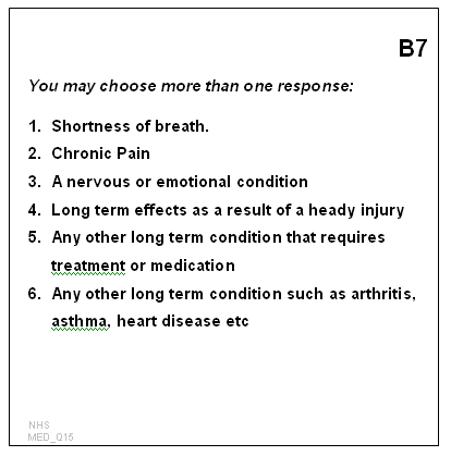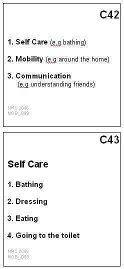 These prompt card guidelines have been designed for use in ABS Household surveys. The guidelines aim to ensure ABS prompt cards are designed according to best practice and are consistent across surveys. The guidelines have been compiled from ABS experience, international research and best practice standards used in the Office of National Statistics (UK) and Statistics New Zealand. Note - The visual examples used in these guidelines are adapted from prompt cards used in ABS surveys (except where noted otherwise), and may not reflect current wording. Number and structure of Response Options Number of prompt cards Prompt cards are used in interviews to visually present response categories to respondents, allowing them to read through the list in their own time. While prompt cards can be very useful in assisting respondents to select the correct response, they should be used only when necessary. Where there is only a small number of simple response categories (e.g. yes/no), a prompt card is unlikely to help the respondent, and is therefore unnecessary. Limiting the number of prompt cards to those essential for helping the respondent reduces the overall number of cards required at each interview. This is more practical for the interviewer and can also reduce the respondent's perceived burden of the interview. Numbering of prompt cards It is recommended that each module should be given an alpha-numeric code, and the cards be numbered in ascending order within each module. For example, if the first module is on personal characteristics, then this module will be called A. If the next module is on income, then this module will be B. Cards within each module will be numbered from 1 upwards (i.e. Module A cards will be numbered A1, A2, A3 etc., and Module B cards will be numbered B1, B2, B3 etc.). This is because prompt cards may need to be changed in between the dress rehearsal and the final enumeration, and it is easier to renumber cards within a module than an entire survey set. The code should appear in the top right hand corner of the prompt card. Number/Order of Response Options The response options on the prompt card should be comprehensive so that they cover the most commonly provided answers (as identified in pre-testing). However, this needs to be balanced with ensuring that the list is not overly long. Long lists of response options increase the risk of primacy effects (where respondents are more likely to choose the first applicable option from the top of the list, without reading the entire list). Long prompt cards can result in questions having to be repeated as respondents are more likely to forget the question after reading the card. It is recommended that unordered lists should not have more than 9 response options listed at any one time. Where there are more than 9 response options, consideration should be given to using headings to group them by theme (see 'Grouping of categories' below), or (where possible) asking a series of questions with fewer response options. However, this is not always possible due to user requirements such as the use of international standard questions or output categories. Numbering for consistency with CATI/CAPI If there are more than 9 response options in a multiple-choice list on a prompt card, the numbering should start at 10 rather than 1, for consistency with Blaise programming standards. This is to avoid ambiguity in the responses entered by the interviewer. For example, the key sequence 113 may be interpreted as 1-13 or 11-3. This confusion can be avoided if all values have the same number of digits. Rating Scales Often prompt card response options contain rating scales. Here categories need to be balanced so there are an equal number of positive and negative choices. A neutral response option should also be provided. It is also generally better if negative options are presented first in the list, especially for sensitive questions. This is to show the respondent that it is acceptable to choose a negative option, should they wish to do so. In general, three or five categories is the appropriate number of options for rating scales. Grouping of categories To avoid using an excessive number of unordered response options, there are two approaches that can be utilised. The first approach involves arranging the options into groups such as main and subcategories. This is outlined in the diagram below. While grouping related responses can help provide structure to the list, headings used to group lengthy response options by theme can be misleading as some respondents can be led to believe they need to choose one response per thematic group. Instructions must be clear if headings are used (see the 'Instructions' section), and the use of headings to group themed options should be consistent throughout the survey. Diagram 1.1: Grouping of Categories The second approach lists the main categories on one prompt card and uses separate cards for the subcategories in each heading. This approach is more suitable when the list of response options is too long to display clearly on one page. It is useful to add an example to the main categories so that respondents know whether the category applies to them. Diagram 1.2: Alternative Grouping of Categories