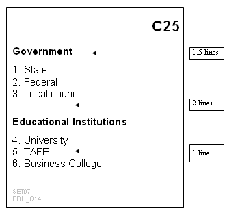 This is not an exhaustive list of instructions. Any other instructions should be clearly worded and placed in italics at the top of the page. The font size used should be the same as the response options. Spacing Line Spacing The recommended spacing between response options is 1.5 to 2 lines, if there are no subcategories or subgroups. If there are main categories and subcategories, there should be: