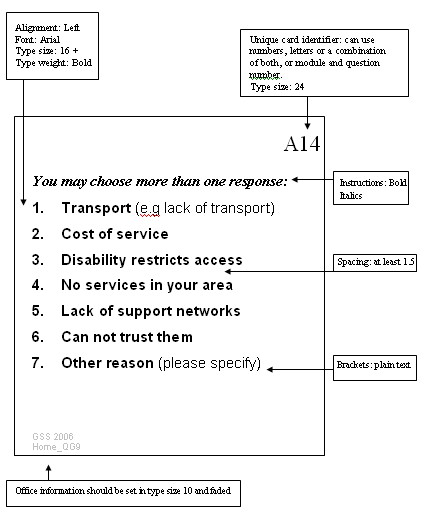 'Don't know', 'Refusal' and Other Options "Don't know" and "refusal" options should not be placed on the prompt card, even if they are placed on the pick list for the interviewer. Whether it is appropriate to include an "other" or "other (specify)" category on the prompt card is dependent on the survey itself and the nature of the topic. Appropriate presentation of cards Folders, booklets or laminated cards The method used to display prompt cards will vary according to the length of the enumeration period and the number of prompt cards. For surveys which are longer than 4-5 months, and/or when there are a large number of prompt cards, it is better to keep the prompt cards in a folder with plastic sheets for increased durability. Many interviewers prefer to use a folder as it easier to keep the pages clean. Folders also allow for easier replacement of cards which need updating during enumeration when this is required. Booklets are generally used when the survey has a shorter enumeration period and there are not too many prompt cards. One advantage of using a booklet is that it avoids the possibility of glare coming from the plastic sheets of the folder. However, folders have an advantage over booklets as bound booklets have the tendency to fall apart. It should also be possible to acquire matt finished plastic for folders. Laminated cards with a matt finish are an alternative option, to ensure durability of prompt cards that will be re-used in the future. It is not appropriate to use high gloss finish cards, as the glare from the cards can interfere with respondents' ability to read the response options. Due to the costs associated with laminating cards, the method of presentation may not always be possible. Repeat identical non-consecutive prompt cards For non-consecutive questions with the same response options, duplicate prompt cards should be used rather than flipping backwards to an earlier prompt card. Flipping backwards gives the respondent the impression that the interview is not progressing. Where consecutive questions require an identical prompt card, a single version is sufficient (i.e. the respondent can stay on one card for two or more consecutive questions). Duplicate copies of individual prompt cards Generally, interviewers should have at least two sets of cards in case one set gets lost/damaged. However, the number of duplicate sets is also dependent on the the length the survey is out in the field. The longer a survey is in the field, the greater is the necessity to have duplicate copies, due to general wear and tear. Duplicate sets are also useful in cases where interviewers have to leave a booklet behind for telephone interviews, or if group interviews are being conducted. Two to three sets are generally sufficient, however, this will vary across surveys. Layout Consistency and Sequence Two important principles should be followed when designing prompt cards: consistency and sequence. All of the type, graphic and layout conventions outlined in these guidelines should be followed consistently through all the prompt cards. Lack of consistency may lead to confusion and errors. Portrait versus Landscape Portrait format is recommended over landscape format. This is because no more than 70 characters per line should be used, as more than 70 characters on one line can be tiring to read. Landscape format allows more than 70 characters to be used, which makes the portrait format a better option. Full Page Layout A full page layout creates a spread-out arrangement of options, which is often the most attractive layout. A split-page layout, where the categories appear in two columns with a vertical line in between, is another option if there is a lengthy list of response options. However, this layout can be more difficult to read. It is generally recommended that if space is an issue, the font size is reduced (to no less than size 16 font - see "Type Size"), or categories are split into more than one page. Visual Design Use of Colour The use of different coloured paper to distinguish and identify different prompt cards can enhance efficiency. However, the use of colour to enhance efficiency must be weighed against the cost of printing on coloured paper. For printing in-house, the current cost of an A4 sheet of white paper is 1 cent, while a coloured A4 sheet is 2 cents (this cost excludes the cost of printing text/images onto the paper). Generally, colour can be deemed useful in the following situations: - The complexity of the survey: for complex surveys with numerous prompt cards, different colours can be used to distinguish modules or topics. -Concurrent Surveys: It can be useful to use different coloured prompt cards for surveys that are being run concurrently with the same interviewer group. -Household spokesperson: It has been suggested that the first prompt card which is used for the household spokesperson be printed on different coloured paper. Caution must be used when choosing the colours to be used, as different colours elicit different reactions in respondents, and this could bias their responses. It is recommended that dark text is used on lightly coloured paper, as white paper can create a glare which can make reading difficult. Off-white or cream coloured paper is preferred, but other light coloured paper can also be considered, as long as contrast and readability are maintained. As noted above, using coloured paper will increase printing costs, so may not always be possible. In these cases, the use of white paper is acceptable. Colour combinations that should never be used are red and green, and yellow and purple, as the combination impedes legibility. Use of Graphics For prompt cards which contain graphics, ensure that the graphics adequately represent the response they require. It can be time consuming and difficult for interviewers to clarify the meanings of images on prompt cards. Accordingly, images should be carefully chosen. For increased legibility and better