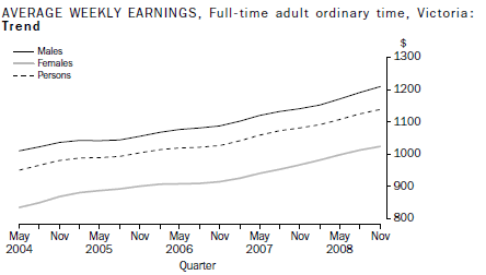 In November quarter 2008, the trend estimate of average weekly full-time adult ordinary time earnings in Victoria was $1,138.40, an increase of 5.3% from November quarter 2007. Over the same period, trend full-time adult ordinary time earnings increased by 6.0% for males and by 5.9% for females.