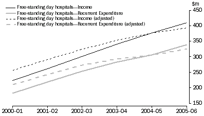 INQUIRIES For further information about these and related statistics, contact the National Information and Referral Service on 1300 135 070 or client.services@abs.gov.au. ALL HOSPITALS COMMENTARY INTRODUCTION This publication presents data for the private hospital sector in 2005–06. Comparable data for public hospitals are available in Australian Hospital Statistics 2005–06, produced by the Australian Institute of Health and Welfare (AIHW). HOSPITALS There were 547 private hospitals operating in Australia in 2005–06 compared with 532 in 2004–05. This represents an overall increase of 2.8% in the total number of private hospitals, reflecting increases in free standing day hospitals (3.6%) and acute and psychiatric hospitals (2.1%). The number of available beds and chairs decreased 0.7% from 26,424 in 2004–05 to 26,227 in 2005–06, due to the decline of 1.0% in the number of beds and chairs in acute and psychiatric hospitals. Total patient separations increased by 5.4% (2.8m in 2004–05 to 2.9m in 2005–06). Private hospitals provided 7.5m days of hospitalisation to patients in 2005–06, up 1.9% on 2004–05. Staff numbers increased by 3.0% to 50,001 people (full-time equivalent). PATIENT CHARACTERISTICS Sex and Age In 2005–06, the demographic profile of private hospital patients has changed very little from the previous year with females accounting for 55% of all patient separations, and people aged 65 and over accounting for 36% of all patient separations. Overall, there were 156.2 patient separations per 1,000 population for females and 129.6 patient separations per 1,000 population for males. Insurance The proportion of patient separations reported as being covered by hospital insurance increased for all private hospitals. In 2005–06, 79% of patient separations reported having hospital insurance compared with 78% in 2004–05. Patient separations reported as being covered by hospital insurance in private acute and psychiatric hospitals increased by 1.3% over the year, while for free-standing day hospitals there was a slight increase of 0.7%. All Private Hospitals, Hospital insurance (a) Procedures performed The total number of procedures increased by 5.9% from 6.2 million in 2004–05 to 6.5 million in 2005–06. Of these procedures, 5.3 million were performed in acute and psychiatric hospitals and the remainder in free-standing day hospitals. The greatest proportion of procedures were non-invasive, cognitive and interventions nec (45%) followed by procedures on the digestive system (12%). Examples of non-invasive and cognitive interventions are services such as dietary education and exercise therapy (often used for development of treatment plans, programs, case reviews or follow up to previous procedures performed). For further details of the classification refer to Volume 3 International Statistical Classification of Diseases and Related Health Problems, 10th Revision-Australian Modification (ICD-10-AM). Similar patterns were reflected in both the acute and psychiatric and free-standing day hospitals. For acute and psychiatric hospitals, non-invasive, cognitive and interventions nec accounted for 47% of all procedures performed in 2005–06, up from 46% in the previous year. The next most common procedures in acute and psychiatric hospitals were on the digestive system (10%), the musculoskeletal system (6.6%) and dental services (4.8%). For free-standing day hospitals, non-invasive, cognitive and interventions nec accounted for the highest proportion of all procedures performed on patients in 2005–06 at 39%. This is followed by procedures on the digestive system (22%), the eye and adnexa (8.2%) and dermatological and plastic procedures (7.6%). The most common principle diagnosis for patient separations from all private hospitals was factors influencing health status and contact with health services (21%). This relates to occasions when circumstances other than a disease, injury or external cause are recorded as 'diagnoses' or 'problems' (see Glossary). The second most common principle diagnosis for patient separations was diseases of the digestive system (16%). Similarly in 2004–05, factors influencing health status and contact with health services represented 21% of patient separations and diseases of the digestive system represented 16% of patient separations. Mode of Separation The majority (97%) of all patients were discharged to their place of usual residence in 2005–06. Patient separations discharged to usual residence increased by 4.1% for private acute and psychiatric hospitals and 8.0% for free-standing day hospitals since 2004–05. For private acute and psychiatric hospitals, Queensland recorded the greatest increase (7.8%) followed by New South Wales (4.6%). These changes can be attributed to the overall increase in patient separations. The number of patients discharged from a private acute and psychiatric hospital to other hospitals increased by 7.1% from 2004-05 to 2005–06. Queensland and South Australia increased transfers to other hospitals by 16% and 7.0% respectively. INCOME & EXPENDITURE Patient activity continued to grow with total income generated totalling $7,001.1m in 2005–06, up from $6,624.1m in 2004–05. Total income from private acute and psychiatric hospitals was $6,591.1m which accounted for 94% of all private hospital income. Total recurrent expenditure for all private hospitals increased by 5.8% to $6,497.9m in 2005–06 from $6,144.1m in 2004–05. For private acute and psychiatric hospitals, the proportion of wages and salaries attributed to recurrent expenses remained almost steady at 52% in 2005-06, and for free-standing day hospitals was consistent with 2004-05 at 39%. The private hospital sector invested $387.4m in building and other capital assets in 2005–06, with private acute and psychiatric hospitals increasing investment from $309.3m in 2004–05 to $370.1m in 2005–06. Free-standing day hospitals decreased inv