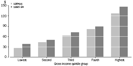 Source: Household Expenditure Survey, Australia: Detailed Expenditure Items (cat. no. 6535.0). Sport and entertainment In 1993-94 Australian households spent on average 19% of their recreation budget, or $15 per week, on entertainment (such as cinema, theatre, night clubs, zoos and sporting events) and recreational services (such as sports participation fees and charges and the hire and repair of sporting and other recreational equipment). Watching and playing sports are favourite recreational pursuits for many Australian households. In 1993-94 households spent an average of $7 per week on sport: $4.25 on sports participation fees and charges such as green fees, court hire, sports lessons, equipment hire, and health and fitness studio charges; $2.50 per week on purchase of sporting equipment; and 50 cents per week on spectator admission to sporting events. Total expenditure on sport ranged from $1.80 per person per week in the lowest quintile to $4.80 per person in the highest quintile. Movies and live theatre are popular forms of entertainment and, despite the growing popularity of home videos, expenditure on these forms of entertainment has not declined. In 1993-94 households spent an average of $2.50 per week on cinema and live theatre admission charges (about half on each). Expenditure per person increased with income level, from 60 cents per person per week in the lowest quintile to $1.70 in the highest quintile. AVERAGE WEEKLY EXPENDITURE ON SPORT, CINEMA AND THEATRE