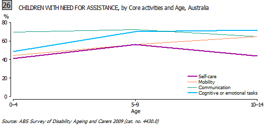 In 2009, a set of age appropriate questions on need for assistance with core-activity tasks was asked about children aged 0-4 years with a disability. In addition, all children with disability aged 14 years and under were asked a set of age appropriate questions relating to cognitive and emotional support. Graph 26 shows the results for each of the areas of interest: