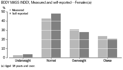 RISK FACTORS SMOKING Almost one in five persons aged 18 years and over (19%) were current daily smokers in 2007-08, down from 21% in 2004-05. Of persons aged 15 years and over, 18% were daily smokers, 2% smoked less often than once a day, 29% were ex-smokers, and 52% reported that they had never smoked. More males than females were current smokers (22% and 18% respectively). For males the prevalence of smoking was highest for those aged 25-34 years (33%), while for females the highest prevalence of smoking occurred across a wide age range (22% each for age groups 18-24 years, 25-34 years, 35-44 years and 45-54 years). ALCOHOL CONSUMPTION Persons were classified to a health risk level (low risk, risky, or high risk) based on their estimated average daily consumption of alcohol during the previous week. Of those males and females who drank alcohol in the previous week (59% of the total population), 21% did so at a risky or high risk level. Males aged 25-34 years reported the highest proportion of drinking at risky and high risk levels (17%). For females the proportions drinking at risky and high risk levels were highest for age groups 18-24 years and 45-54 years (both 14%). EXERCISE In 2007-08, 65% of respondents aged 15 years or more had exercised for fitness, recreation or sport during the two weeks prior to interview. Almost half (48%) of respondents aged 15 years or more reported they walked for exercise in the two weeks prior to interview, 36% did some form of moderate exercise (exercise which caused a moderate increase in heart rate or breathing) and 15% did vigorous exercise (exercise which caused a large increase in heart rate or breathing). Females were more likely to walk for exercise than males (51% compared with 44%) while males were more likely than females to do moderate exercise (38% compared with 33%) and vigorous exercise (19% compared with 11%). Moderate and vigorous exercise were most common among younger age groups while the highest proportions walking for exercise were recorded in the 45-54 year, 55-64 year and 65-74 year age groups (around 51%). The National Physical Activity Guidelines for Australia recommend exercise of at least a moderate level (including brisk walking), most days of the week, for a total of 30 minutes or more on each of those days, and with each exercise session lasting 10 minutes or more. Results of the NHS cannot be assessed directly in relation to these recommendations. However, the survey did find that 24% of those who exercised at a moderate level, and 21% of those who exercised at a vigorous level, exercised 7 times or more in the previous two weeks. Of those respondents who reported doing moderate or vigorous exercise, 83% and 87% respectively reported the average duration of each session was 30 minutes or more. Of those who walked for exercise, 37% did so 7 times or more in the last 2 weeks, and 85% did so for periods of 30 minutes or more on average. BODY MASS INDEX For the first time since the National Nutrition Survey (NNS) in 1995, the 2007-08 NHS measured the hip and waist circumference, height and weight of respondents aged 5 years and over, as well as seeking self-reported data for height and weight from persons aged 15 years and over in line with previous surveys. Excluding those for whom height or weight data were not available, measured Body Mass Index (BMI) results from the survey show 25% of persons aged 18 years and over to be obese, 37% overweight, 37% normal weight and 2% underweight. The highest rate of overweight/obesity was in the 65-74 year age group, at 75%. More adult males (68%) were overweight or obese than adult females (55%). When compared with measured results from the 1995 National Nutrition Survey (NNS), the proportion of persons aged 18 years and over who were classified as overweight or obese has increased. Excluding those for whom height or weight data were not available, the proportion of males classified as overweight or obese based on actual measurements rose from 64% in 1995 to 68% in 2007-08. The increase over this time for females was from 49% to 55%. For children aged 5-17 years in 2007-08, 25% were classified as overweight or obese, comprised of 17% classified as overweight and 8% as obese. Proportions of overweight or obese were similar for both boys and girls at 26% and 24%, however the proportion of boys who were obese (10%) was higher than the proportion of girls (6%). Self-reported BMI results from the survey show that 21% of persons aged 18 years and over were classified as obese, 35% overweight, 42% normal weight and 2% as underweight. The highest rate of overweight/obesity was in the 55-64 year age group at 67%. More males (63%) were overweight or obese than females (48%). Based on self-reported data, the proportion who were classified as overweight/obese has been steadily increasing from 50% in 2001 to 54% in 2004-05 and 56% in 2007-08. Both male and female adults generally underestimated their weight with 68% of males and 55% of females being classified as overweight or obese based on actual measurements compared to self-reported data, 63% and 48% respectively. DIETARY INDICATORS Information was collected in the survey about the usual intake of fruit and vegetables by people aged 5 years or more, and about types of milk they consumed (as an indicator of fat intake). Some care should be taken in interpreting the data on fruit and vegetable intake due to the difficulties respondents had in estimating the quantities consumed. Survey results for 2007-08 show that females aged 15 years and over consumed more fruit and vegetables overall than their male counterparts. Of persons aged 15 years and over, 56% of females and 46% of males met the recommended daily intake of fruit, while 10% of females and 7% of males met the recommended daily intake of vegetables. Females were also more likely to meet the recommended daily intake of both fruit and vegetables (8%), compared with 5% of males. The highest 