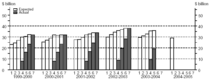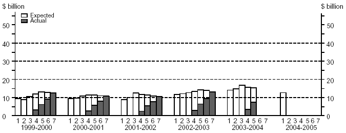 The graphs below show the seven estimates of actual and expected expenditure for each financial year. The estimates appearing below relate to data contained in tables 5 and 6. Advice about the application of realisation ratios to these estimates is in paragraphs 24 to 27 of the Explanatory Notes.