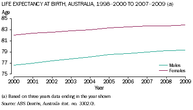COMMENTARY LIFE EXPECTANCY Life expectancy at birth in the decade to 2009 has, on average, been higher for females than males. A baby boy born in 2007-2009 could expect to live, on average, 79.3 years, while a baby girl born in 2007-2009 could expect to live 83.9 years. However, over the decade to 2009, life expectancy at birth for males increased more quickly (up 2.7 years) than for females (up 1.9 years). Life expectancy at birth is one of the most widely used and internationally recognised indicators of population health. It focuses on the length of life rather than on its quality, and provides a useful summary of the general health of the population. The increases in life expectancy have been due to lower infant mortality, the promotion of healthier lifestyles, continued improvements in living standards, and ongoing medical advances leading to improvement in prevention, diagnosis and treatment of diseases. (Endnote 1) RESIDUAL LIFE EXPECTANCY AT AGE 65 There has been an increase in the average number of additional years that persons at all ages can expect to live. Women aged 65 years in the period 2007-2009 could expect to live another 21.8 years, up from 20.4 years in 1998-2000, while men aged 65 years could expect to live another 18.7 years in 2007-2009 compared to 16.8 years in 1998-2000. These increases in residual life expectancy at age 65 years are mainly due to improvements in aged care management, a decline in the number of deaths from chronic conditions such as heart disease, cancer and strokes (because of medical advances), and behavioural changes such as improvements in diet and lower rates of smoking. (Endnote 2) PROBABILITY OF SURVIVAL FROM BIRTH TO AGE 85 The probability of surviving from birth to age 85 has gradually increased for both males and females over the past decade. About 41% of males born in 2007-2009 could expect to live to at least 85 years, while for females, the proportion is 16 percentage points higher at 57%. In 1998-2000, the probability of males surviving to age 85 was 31%, and was 50% for females. Life expectancy of Aboriginal and Torres Strait Islander peoples While Australians can generally expect to live a relatively long life, there are differences in life expectancy between population groups within Australian society. In particular, life expectancy at birth for Aboriginal and Torres Strait Islander Australians is lower than it is for the non-Indigenous population. In 2005-2007, life expectancy at birth for Aboriginal and Torres Strait Islander males was 67.2 years, 11.5 years less than that for non-Indigenous males (78.7 years). For Aboriginal and Torres Strait Islander females, life expectancy at birth was 9.7 years less than for non-Indigenous females (72.9 years and 82.6 years respectively). The lower life expectancy for Aboriginal and Torres Strait Islander Australians can be attributed to a higher infant mortality rate, and a higher incidence of diseases such as diabetes mellitus, respiratory disorders, ear disease, eye disorders and some cancers, among Aboriginal and Torres Strait Islander peoples. (Endnote 1) For Aboriginal and Torres Strait Islander peoples, the difference in life expectancy for males (67.2 years) and females (72.9 years) reflects the situation for the non-Indigenous people, with higher life expectancy for females (82.6 years) than for males (78.7 years). ENDNOTES 1. Australian Bureau of Statistics, 2010, Measures of Australia's Progress, 2010, (cat. no. 1370.0), ABS, Canberra, <www.abs.gov.au>. 2. Australian Bureau of Statistics, 2011, Australian Social Trends, Mar 2011, (cat. no. 4102.0), ABS, Canberra, <www.abs.gov.au>. HEALTH LINKS Glossary Data Cube Document Selection These documents will be presented in a new window.