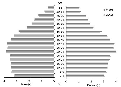 p preliminary estimated resident population, based on 2001 Census. POPULATION The estimated resident population of Victoria at June 2003 was 4.9 million, an increase of 60,083 people since June 2002. This represents an annual growth rate of 1.2%. In 2003 Victoria's population was 24.7% of the Australian total. At June 2003 there were an estimated 3.6 million people resident in the Melbourne Statistical Division (SD), representing an increase of 46,534 people between June 2002 and June 2003. Melbourne SD was home to nearly three-quarters (72%) of Victoria’s population at June 2003 and accounted for 77% of Victoria's population growth between June 2002 and June 2003. The map below shows the percentage change in population between 2002 and 2003 for Victorian Statistical Divisions. The highest growth rate was experienced in the SDs of Barwon and Goulburn (1.4%), while the SD of Wimmera recorded negative growth for the period. Figure 1: Percentage population change: Victoria by Statistical Divsion MEDIAN AGE The median age, the age at which half the population is older and half is younger, for Victoria increased from 36.0 years in 2002 to 36.2 years in 2003. For Victorian males, the median age increased from 35.2 years in 2002 to 35.4 years in 2003 and for Victorian females, the median age increased from 36.8 years in 2002 to 37.1 years in 2003. In the same time, the Australian median age increased from 35.9 years in 2002 to 36.1 years in 2003. The Statistical Division (SD) of Melbourne recorded the lowest median age, with 35.6 years, and was the only SD to record a lower median age than the whole of Victoria (36.2 years). In comparison, the median age in the Balance of Victoria (Victoria excluding the Melbourne SD) was 38.3, with the highest recorded in the SDs of East Gippsland (41.2 years), Wimmera (40.7 years) and Gippsland (38.9 years). The LGA which recorded the highest median age both in 2002 and 2003 was Queenscliffe with 48.6 years and 49.3 years respectively. Other LGAs recording high median ages in 2003 were Strathbogie (45.9 years), Buloke and Bass Coast (both 44.4 years), and Loddon (44.1 years). The LGA with the lowest median age both in 2002 and 2003 was Melbourne with 28.1 years recorded in both years. Other LGAs with low median ages in 2003 were Melton (30.2 years), Wyndham (31.8 years), Casey and Hume (both 32.0 years). AGE DISTRIBUTION Figure 2 : PERCENTAGE OF POPULATION IN AGE GROUPS, Victoria - 2002 and 2003 Children (persons aged 0-14 years) Children represented 19.5% of the Victorian population at June 2003, a decrease from the 2002 proportion of 19.7%. A declining proportion of children was experienced nationally, with children representing 20.0% of the Australian population in 2003, compared to 20.3% in 2002. For the Balance of Victoria children make up 21.0% of the total population, compared to 18.9% for the Melbourne SD. The highest proportions of persons in this age group can be found in the SDs of Mallee (22.4%), Western District (21.9%) and Goulburn (21.8%), while the lowest proportions outside Melbourne SD were Barwon (19.9%), East Gippsland (20.0%) and Wimmera (20.6%). The LGAs with the highest proportion of children in 2003 were Casey (25.2%) and Hume (24.9%). Casey and Hume LGAs also recorded the highest proportion of children in 2002 with 25.6% and 25.3% respectively. In 2003 the following LGAs also recorded a high proportion of children: Melton (24.6%), Cardinia (24.5%), Mitchell (24.4%), Wyndham (24.4%), Moorabool (24.0%), and Nillumbik (23.5%). The LGA with the lowest proportion of children at June 2003 was Melbourne (7.6%), which also recorded the lowest proportion of children in 2002 (8.3%). In 2003 this was followed by the LGAs (excluding Unincorporated Victoria) Port Phillip (10.2%), Yarra (11.4%), Stonnington (13.2%), and Monash (15.1%). Persons aged 15-64 years Persons aged 15-64 years accounted for 67.3% of the Victorian population in 2003 compared to 67.2% in 2002. In both 2002 and 2003, the proportion of persons aged 15-64 in Victoria, was slightly higher than the national averages of 67.1% in 2002 and 67.2% in 2003. For 2003 the Melbourne SD recorded the highest proportion of persons aged 15-64 (68.6%), marginally higher than the Victorian proportion (67.3%). Balance of Victoria showed a lower proportion of persons aged 15-64 than the Victorian total, with 63.9%, and the lowest proportions of this age group recorded in the SDs of Wimmera (60.7%), Mallee (62.2%) and Western District (62.4%). The highest proportions of persons aged 15-64 years in 2003 were in the LGAs of Melbourne (84.9%), Yarra (78.7%) and Port Phillip (78.6%), as was the case in 2002, when the proportions were 83.8%, 78.7% and 78.5% respectively. In 2003 these LGAs (excluding Unincorporated Victoria) were followed by Stonnington (72.7%), Melton (70.7%) and Nillumbik (70.2%). In 2003, the lowest proportion of persons aged 15-64 years were recorded in the LGAs of Queenscliffe (54.2%), Yarriambiack (57.3%) and Hindmarsh (58.0%). In 2002, Queenscliffe, Yarriambiack and Hindmarsh also recorded the lowest proportions of persons aged 15-64 years (54.1%, 57.3% and 57.5% respectively). In 2003 other LGAs which recorded lower proportions of 15-64 year olds were Buloke (59.0%), Bass Coast (59.8%), and Gannawarra (60.1%). Persons aged 65 years and over Persons aged 65 years and over accounted for 13.2% of the Victorian population in 2003, representing more of the population than in 2002 (13.1%) and a higher proportion of the population compared to the 2003 and 2002 national proportions of 12.8% and 12.7% respectively. The Melbourne SD recorded a proportion of 12.5% for persons aged 65 and over, compared to 13.2% for Victoria as a whole. Balance of Victoria recorded higher proportions of persons aged 65 and over than Victoria as a whole, with the highest proportions recorded in the SDs of Wimmera (18.7%), East Gippsland (17.0%) and Western District (15.7%). The LGAs with the highest propor