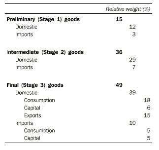 4.1 The values of commodity flows, for both domestic supply and imports, were allocated to stages based on an analysis of detailed 1989–90 Input-Output tables. Three stages of production have been adopted.