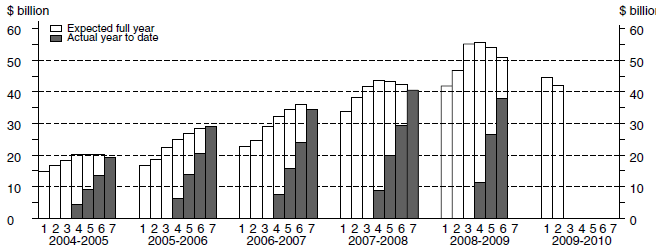 The graphs below show the seven estimates of actual and expected expenditure for each financial year. The estimates appearing below relate to data contained in tables 5 and 6. Advice about the application of realisation ratios to these estimates is in paragraphs 25 to 28 of the Explanatory Notes.