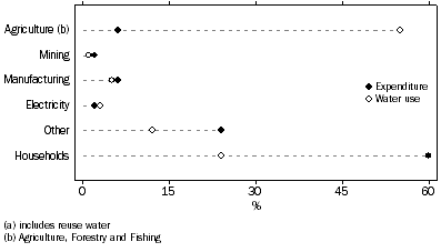 The figure below compares relative consumption of distributed water with relative expenditure on water. The Agriculture, forestry and fishing industry used 55% of total distributed water, while households accounted for 24%. Expenditure on distributed water by the Agriculture, forestry and fishing industry was only 6% of the national total, compared to 60% for households. This difference in physical water use and corresponding expenditure is associated with different costs of storage, treatment and delivery of water used by urban and rural users. The Agriculture, forestry and fishing industry also undertakes expenditure on self sourced water, which is not included in this comparison. EXPENDITURE AND PHYSICAL USE OF DISTRIBUTED WATER (a), by industry and households—2009–10 ABS has developed a new method for estimating household expenditure on distributed water resulting in revisions to the 2008–09 household expenditure estimates (see Explanatory Notes, paragraph 51). The table below displays the State and Territory breakdown of the expenditure on urban distributed water by households in 2009–10. New South Wales households recorded the highest expenditure ($1,116 million), which accounted for 32% of the national expenditure by households. New South Wales households also recorded the highest physical use of urban distributed water (527 GL or 32% of total water use by households). Although Victoria (323 GL) and Queensland (330 GL) displayed similar water usage, Queensland's expenditure was 28% higher than that of Victoria. Queensland households pay the highest unit price for urban distributed water ($2.46 per kL). The highest annual average expenditure per household occurred in Western Australia ($531 per household per annum).