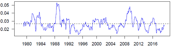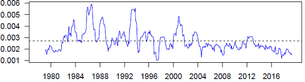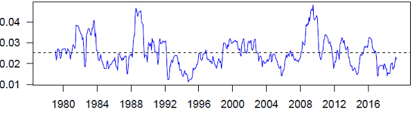 The chart shows that the current levels of volatility for employed persons are below the series average since 2004, around 0.0021%, and lower than the average across the entire timeseries. Unemployed persons and the unemployment rate Chart 2 and Chart 3 show the volatility of unemployed persons and the unemployment rate respectively. The charts show that the volatility in these estimates has been below the long term average in recent years.