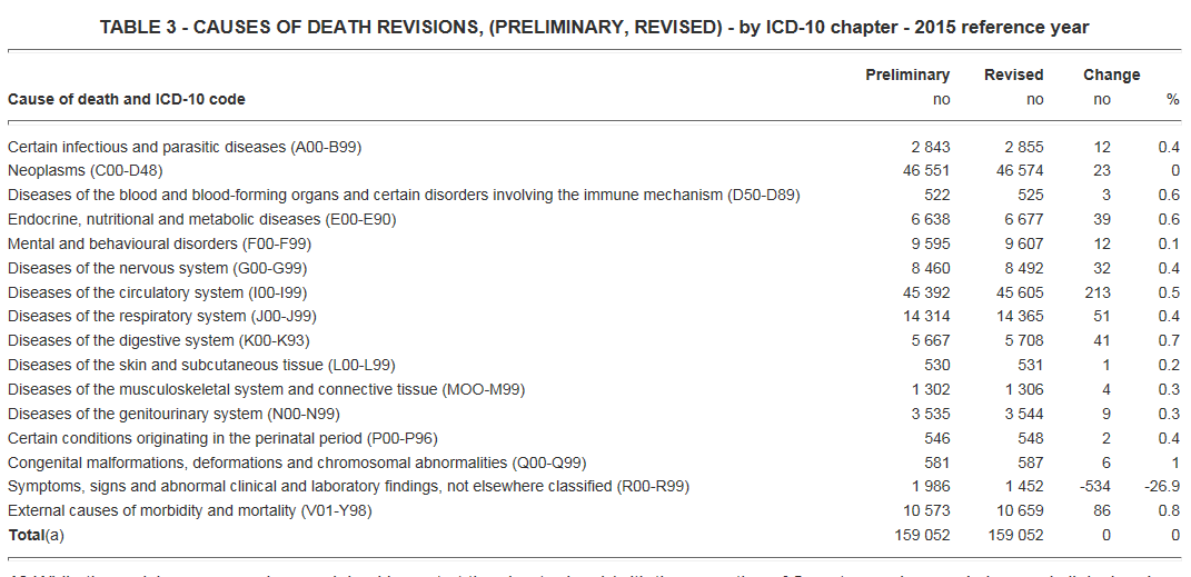 TABLE 3 - CAUSES OF DEATH REVISIONS, (PRELIMINARY, REVISED) - by ICD-10 chapter - 2015 reference year