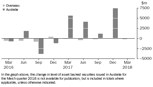 Assets of Securitisers At 31 March 2018, total assets of Australian securitisers were $132.7b, up $0.2b (0.2%) on 31 December 2017. During the March quarter 2018, the rise in total assets was primarily due to an increase in residential mortgage assets (up $1.0b, 0.9%), Credit card loans and trade receivables assets (up $0.7b, 21.3%) and Non-residential mortgage loans assets (up $0.2b, 12.4%). This increase was largely offset by a decrease in Other Loans assets (down $1.9b, 11.9%). Liabilities of Securitisers At 31 March 2018, total liabilities of Australian securitisers were $132.7b, up $0.2b (0.2%) on 31 December 2017. The increase in total liabilities was primarily due to an increase in loans and placements (up $0.6b, 7.9%). This was offset by a notable decrease in long term asset backed securities issued in Australia (down $0.4b, 0.4%). CHANGE IN LEVEL OF ASSET BACKED SECURITIES, from previous quarter Asset backed securities issued overseas as a proportion of total liabilities decreased to 2.1%, down 0.2 percentage points on the December quarter 2017 proportion of 2.3%. NOTES FORTHCOMING ISSUES