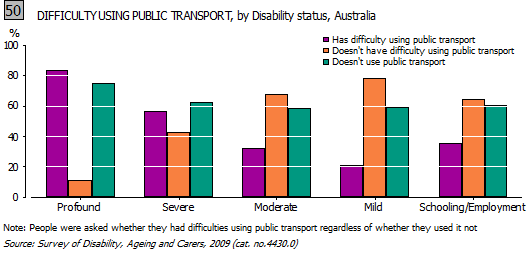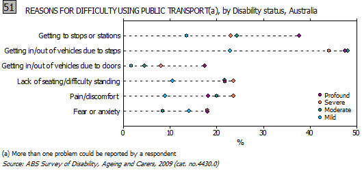 The difficulties people with disabilities experience using public transport vary with the nature of their disability (Graph 51). People with profound core activity limitations reported the most common difficulties they had using public transport were getting to stops or stations (38%) and getting in or out of vehicles or carriages due to steps (48%). In contrast, the main difficulties people with mild core activity limitations reported were due to difficulty getting into or out of vehicles because of steps (23%) and fear and anxiety (14%).