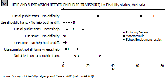 Of the 479,700 people with a profound core activity limitation aged 5 years or more living in households, 11% could use all forms of public transport with no difficulty, 14% could use some but not all forms of public transport while needing help or supervision, and 45% could not use any form of public transport at all (Graph 52). |
