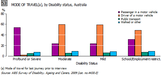 The mode of transport a person with a disability used reflected the level of independence their disability allows them (Graph 53). Just over 580,000 (54%) people with a profound or severe core activity limitation were a passenger in a motor vehicle for their last journey prior to interview, compared to 24% of those with a moderate core activity limitation; 716,000 (59%) people with a mild core activity limitation were the driver of a motor vehicle compared to 25% of those with a profound core activity limitation. Those with profound or severe core activity limitations were the least likely to have walked or used public transport for their last journey. |