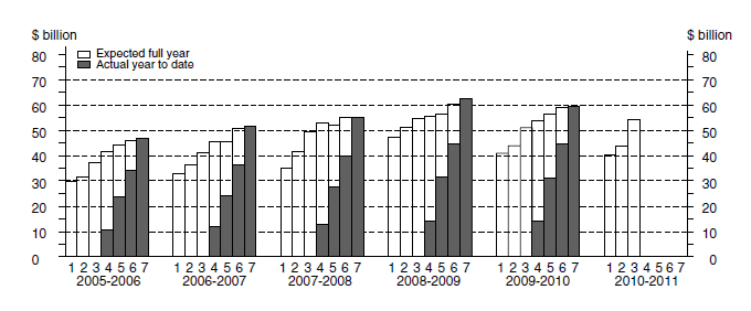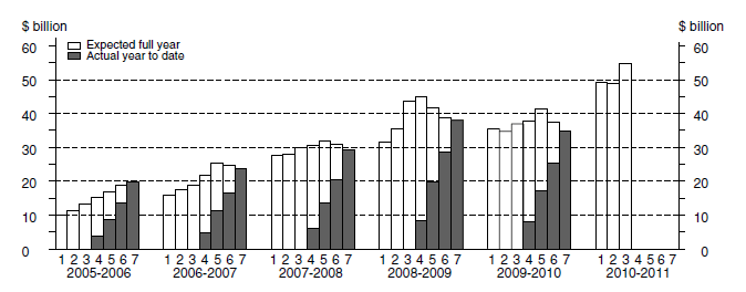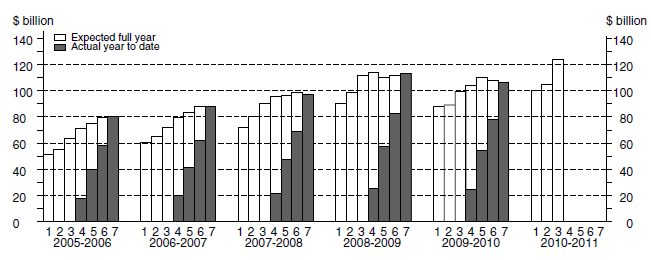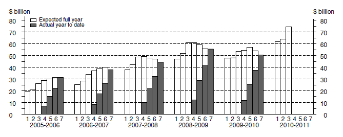 ACTUAL AND EXPECTED NEW CAPITAL EXPENDITURE TOTAL CAPITAL EXPENDITURE Estimate 7 for total capital expenditure for 2009-10 is $106,076 million. This is 6.2% lower than Estimate 7 for 2008-09. The main contributors to this decrease, by detailed industry, were Mining (-8.5%) and Transport, Postal and Warehousing (-14.9%). Of note, Estimate 7 for Construction is $2,049 million which is 50.0% higher than the same estimate for 2008-2009. Estimate 7 for total capital expenditure is 1.8% lower than Estimate 6 for 2009-2010. Mining (-7.0%) was the main contributor to this decrease with $2,610 million less spent in the June quarter compared to planned spending reported in the March Survey. Estimate 3 for total capital expenditure for 2010-2011 is $123,334 million. This is 24.3% higher than Estimate 3 for 2009-10. Mining (48.4%) was the most significant contributor to this increase. Estimate 3 for total capital expenditure is 17.5% higher than Estimate 2 for 2010-11. The main contributors to this increase were Mining (12.2%), Rental, Hiring and Real Estate Services (34.1%) and Transport, Postal and Warehousing (34.0%). The comparison of these estimates by detailed industry indicates that all industries increased spending plans for 2010-11 in the June quarter. BUILDINGS AND STRUCTURES Estimate 7 for buildings and structures for 2009-10 is $50,685 million which is 8.7% lower than Estimate 7 for buildings and structures for 2008-09. By major industry, the main contributors to this decrease were Other selected industries (-10.7%) and Mining (-7.2%). Estimate 7 for buildings and structures is 6.0% lower than Estimate 6 for 2009-10. Mining (-7.9%) was the main contributor to this decrease between estimates. Estimate 3 for buildings and structures for 2010-11 is $74,567 million. This is 39.1% higher than Estimate 3 for 2009-10. Mining (54.9%) was the main contributor to this increase. Estimate 3 for buildings and structures for 2010-11 is 16.9% higher than Estimate 2. By major industry, the main contributors to this increase were Other selected industries (29.7%) and Mining (13.0%). EQUIPMENT, PLANT AND MACHINERY Estimate 7 for equipment, plant and machinery for 2009-10 is $55,391 million. This is 3.8% lower than Estimate 7 for 2008-09. By detailed industry, Mining (-12.1%) was the main contributor to this decrease between estimates while Construction rose 52.8%. Estimate 7 for equipment, plant and machinery for 2009-10 is 2.4% higher than for Estimate 6 for 2009-10. By detailed industry, Estimate 7 for Construction was 17.2% higher than Estimate 6, which contributed most to this increase between estimates. Estimate 3 for equipment, plant and machinery for 2010-11 is $48,767 million. This is 7.0% higher than Estimate 3 for 2009-10. Rental, Hiring and Real Estate Services (42.4%) was the main contributor to this increase. Estimate 3 for equipment, plant and machinery is 18.3% higher than Estimate 2 for 2010-11. By major industry, Mining (9.4%), Manufacturing (22.3%) and Other selected industries (21.0%) all increased between these estimates. MINING Estimate 7 for Mining for 2009-10 is $34,756 million. This is 8.5% lower than Estimate 7 for 2008-09. Estimate 7 is 7.0% lower than Estimate 6 for 2009-10. Buildings and structures is 7.9% lower and equipment, plant and machinery is 4.3% lower than corresponding sixth estimates for 2009-10. Estimate 3 for Mining for 2010-11 is $54,817 million. This is 48.4% higher than the corresponding estimate for 2009-10. Estimate 3 is 12.2% higher than Estimate 2 for 2010-11. Buildings and structures is 13.0% higher and equipment, plant and machinery is 9.4% higher than corresponding second estimates for 2010-11. MANUFACTURING Estimate 7 for Manufacturing for 2009-10 is $11,705 million. This is 7.7% lower than Estimate 7 for 2008-09. Estimate 7 is 0.6% lower than Estimate 6 for 2009-10. Buildings and structures is 3.4% lower and equipment, plant and machinery is 0.9% higher than corresponding sixth estimates for 2009-10. Estimate 3 for Manufacturing for 2010-11 is $14,094 million. This is 24.7% higher than Estimate 3 for 2009-10. Estimate 3 is 12.4% higher than Estimate 2 for 2010-11. Buildings and structures is 3.1% higher and equipment, plant and machinery is 22.3% higher than corresponding second estimates for 2010-11. OTHER SELECTED INDUSTRIES Estimate 7 for Other selected industries for 2009-10 is $59,616 million. This is 4.6% lower than Estimate 7 for 2008-09. By detailed industry, Transport, Postal and Warehousing (-14.9%) and Information Media and Telecommunications (-20.6%) have contributed most significantly to the decrease between these estimates. Construction (50.0%) rose strongly between these estimates. Estimate 7 for Other selected industries is 1.2% higher than Estimate 6 for 2009-10. Buildings and structures is 4.1% lower and equipment, plant and machinery is 4.3% higher than corresponding sixth estimates for 2009-10. By detailed industry, Construction (15.6%) contributed most to the increase between estimates. Estimate 3 for Other selected industries for 2010-11 is $54,423 million. This is 6.8% higher than Estimate 3 for 2009-10. Building and structures is 15.5% higher and equipment, plant and machinery is 0.7% higher by this comparison of estimates. By detailed industry, Rental, Hiring and Real Estate Services (48.0%) contributed most to the increase between these estimates. Estimate 3 for Other selected industries is 24.7% higher than Estimate 2 for 2010-11. Buildings and structures is 29.7% higher and equipment, plant and machinery is 21.0% higher than Estimate 2 for 2010-11. By detailed industry, all industries rose compared to Estimate 2 while Rental, Hiring and Real Estate Services (34.1%) and Transport, Postal and Warehousing (34.0%) contributed most significantly to the increase between these estimates. Document Selection These documents will be presented in a new window.
