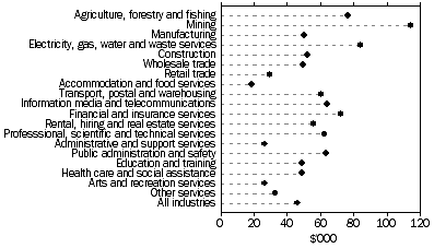 SUMMARY OF FINDINGS EARNINGS Earnings, which includes gross wages and salary, the ungrossed value of fringe benefits, and severance, termination and redundancy payments, is the largest component of labour costs. During 2010-11, earnings accounted for 87.3% of total labour costs with a value of $541,296 million. Private sector earnings totalled $418,055 million (77.2% of total earnings) and public sector earnings were $123,241 million (22.8% of total earnings). Earnings per employee were higher for the public sector ($65,089) compared with the private sector ($42,658). Earnings per employee were highest in the Australian Capital Territory ($57,464) and Northern Territory ($48,879) and lowest in Queensland ($42,343). Earnings per employee were highest in the Mining ($114,433) and Electricity, Gas, Water and Waste Services ($83,984) industries, and lowest in the Accommodation and Food Services ($18,317) and Arts and Recreation Services ($26,661) industries. SUPERANNUATION During 2010-11, the value of employer superannuation contributions paid on behalf of employees in Australia was $46,989 million, or 7.6% of total labour costs. The private sector accounted for $34,956 million or 74.4% of employer contributions and the public sector, $12,033 million (25.6%). Superannuation costs per employee were $4,020. Superannuation costs per employee were significantly higher in the public sector ($6,355), than the private sector ($3,568). The Australian Capital Territory had the highest superannuation costs per employee with $6,896 while Queensland had the lowest with $3,708 per employee. The Mining and Electricity, Gas, Water and Waste Services industries had the highest superannuation costs per employee at $9,946 and $8,242 respectively. Industries with the lowest superannuation costs per employee were Accommodation and Food Services, Administrative and Support Services, and Arts and Recreation Services ($1,506, $2,136 and $2,205 respectively). PAYROLL TAX Payroll tax paid by employers during 2010-11 totalled $18,631 million, representing 3.0% of total labour costs. The payroll tax cost per employee was higher in the public sector ($1,927) than in the private sector ($1,529). Payroll tax per employee was highest in the Northern Territory ($1,763) and New South Wales ($1,753), and lowest in the Australian Capital Territory ($1,041). A large proportion of organisations in the Australian Capital Territory have payroll tax exemptions as they are engaged in general government activities. As a proportion of total labour costs, payroll tax was highest in Tasmania (3.4%) and lowest in the Australian Capital Territory (1.6%). Across industries, payroll tax as a proportion of total labour costs was highest in Mining (4.6%), followed by Electricity, Gas, Water and Waste Services (4.0%) and Finance and Insurance Services (3.9%). The industry with the smallest proportion of payroll tax to total labour costs was Health Care and Social Assistance (0.9%). As a cost per employee, payroll tax was highest in Mining ($6,216), and lowest in Health Care and Social Assistance ($485). For small businesses (fewer than 20 employees), payroll tax accounted for only 1.5% of total labour costs. For medium businesses (20 to 99 employees) and large businesses (100 employees or more), payroll tax accounted for 3.3% and 3.4% respectively. WORKERS' COMPENSATION Total workers' compensation costs during 2010-11 were $10,249 million, representing 1.7% of total labour costs. Workers' compensation costs per employee were slightly higher in the public sector ($1,058) than the private sector ($842). However, as a proportion of total labour costs, workers' compensation costs were higher in the private sector (1.7%) than the public sector (1.4%). Workers' compensation costs per employee were highest in South Australia ($1,081) and lowest in Tasmania ($673). Workers' compensation costs as a proportion of total labour costs were highest in South Australia (2.1%) and lowest in Tasmania (1.3%). Document Selection These documents will be presented in a new window.