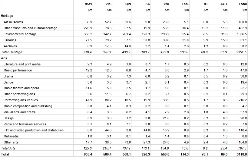 Government spend on culture remains steady The Australian Bureau of Statistics (ABS) reported today that the total expenditure funded by government for cultural activities in 2010-11 was $6,650.2m. The ABS Director of Culture, Recreation and Migration Statistics, Andrew Middleton, said that today's Cultural Funding by Government, Australia release contains estimates of Australian public funding for environmental heritage and arts and cultural activities by the Australian Government, state and territory governments and local governments. "Government spending for cultural activities was relatively consistent between 2010-11 and 2009-10, with an increase of less than 1 per cent ($21.5m)," said Mr Middleton. "The federal Government contributed one third ($2,271.6m), state and territory governments contributed nearly half (47 per cent or $3,118.9m) and local government contributed $1,259.9m. "The highest expenditure of Australian Government funds was for radio and television services with $1,209.2m. "At the state and territory government level, the highest expenditure of government funds was for environmental heritage, with $1.306.5m. "The estimate of expenditure by the three tiers of government, in 2010-11, averaged $299.80 per person in Australia which was a fall from $302.30 in 2009-10. "Recurrent expenditure was $5,771.8m, an increase of 2 per cent from 2009-10, and capital expenditure was $878.4m which was a decrease of 7 per cent from 2009-10" said Mr Middleton. More details, including data for individual states and territories, can be found in Cultural Funding by Government, 2010-11 (cat. no. 4183.0) available free on the ABS website <www.abs.gov.au>. Media note: When reporting ABS data, the Australian Bureau of Statistics (or ABS) must be attributed as the source. Government spending on cultural activities by state and territory, 2010-11 Document Selection These documents will be presented in a new window.