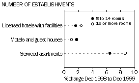 OVERVIEW The number of accommodation establishments increased over the twelve months to the end of 1999. Visitor hostels (up 5% to 649) and serviced apartments (up 8% to 880) had the largest proportional increases. These two accommodation types also showed the largest increases in capacity - up 15% or 4,252 guest rooms for serviced apartments, and up 11% or 4,206 bed spaces for visitor hostels. Significant growth also occurred in letting entities with 5 to 14 holiday flats, units and houses, with an increase of 8% or 59 letting entities, contributing an additional 7% or 452 flats, units and houses since 1998. HOTELS, MOTELS AND GUEST HOUSES AND SERVICED APARTMENTS At the end of December 1999, there were a total of 5,705 hotels, motels and guest houses and serviced apartment establishments with 5 or more rooms providing a total of 208,874 guest rooms. Establishments with 15 or more rooms accounted for 66% of the establishments and 91% of the guest rooms. The increase in the number of establishments since December 1998 was 3% while the increase in guest rooms was 4%. The number of guest rooms in establishments with 5 to 14 rooms rose by 2% to 18,795, while the number of guest rooms in larger establishments rose by 4% to 190,079. Motels and guest houses accounted for nearly two thirds (64%) of the accommodation establishments in this group, and nearly half (47%) of the guest rooms. Licensed hotels comprised 21% of establishments and 37% of capacity, while serviced apartments, the fastest growing category, accounted for 15% of establishments and 16% of the capacity. Licensed hotels There were 1,191 licensed hotels with 5 or more rooms at the end of 1999, supplying a total 77,356 guest rooms. This represented an increase in the number of establishments since 1998 of 2% and an increase in capacity of 4%. Licensed hotels with 15 or more rooms comprised 64% of the establishments and 95% of the guest rooms in this category. At the end of 1999, licensed hotels with 5 to 14 rooms had an average of 9 rooms per establishment. The average number of rooms per establishment of those with more than 15 rooms, varied from 120 rooms in New South Wales, Queensland and the Australian Capital Territory to 53 rooms in Tasmania. Motels and guest houses There were 3,634 motels and guest houses with 5 or more rooms at the end of December 1999, supplying a total of 98,298 guest rooms. One third of these had fewer than 15 rooms. Motels and guest houses showed the slowest growth of only 1% in establishments and 2% in capacity when compared with licensed hotels and serviced apartments. Motels and guest houses with 5 to 14 rooms showed most of the growth since 1998 in the number of establishments, up by 2% to be 1,221. Serviced apartments There were 880 serviced apartment establishments, providing a capacity of 33,220 guest rooms at the end of 1999. Serviced apartments showed the greatest growth in capacity between December 1998 and December 1999 with the number of establishments increasing by 8% and the number of guest rooms up by 15%. Queensland accounted for 40% of all serviced apartment establishments with an average size of 39 rooms per establishment.