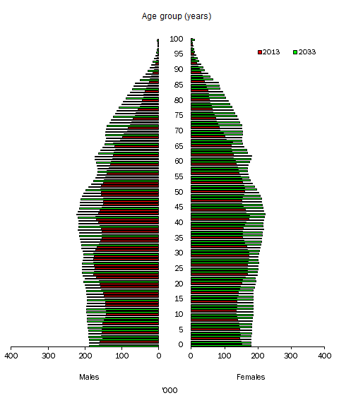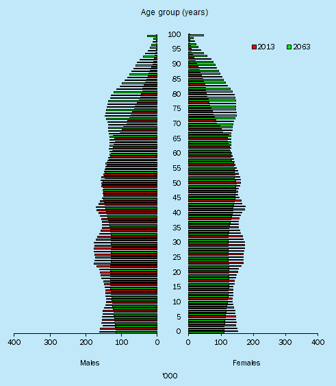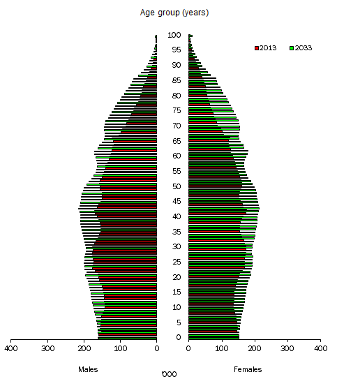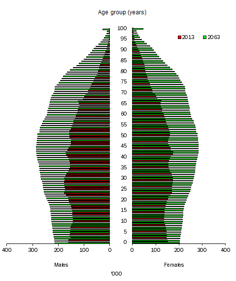 Population pyramids are used to show the extent of each change, overlaying the 2013 estimated resident population with each projected population. Ultimately, the size and shape of our population reflects over 100 years of births, deaths and migration, influenced by major policy and social changes, two world wars, significant improvements in public health, and the advent of widely available, effective contraception. Therefore, regardless of whether higher or lower assumptions are applied to the population over the next 20 and 50 years, much of the impact of these cumulative longer term historical changes will still be visible in the shape and size of the resulting projected populations.