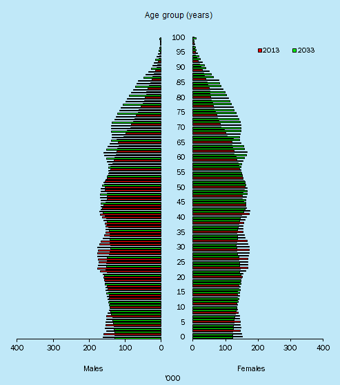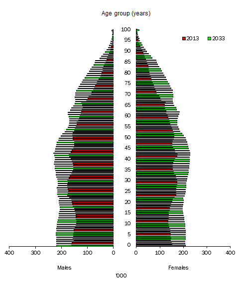 Under this scenario, the population would be 31 million in 2033. The proportion of people aged 65 years and over would increase