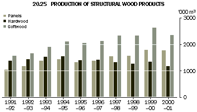 In the past decade, reduced availability of hardwood sawlogs and increased availability of softwood sawlogs and pulpwood resulted in significant changes in the relative prices of these production inputs, and consequently in the production mix of structural wood products and their prices to consumers. Sawn hardwood prices rose strongly relative to sawn softwood- and pulpwood-based products such as wood-based panels (graph 20.23). With these trends projected to continue throughout the current decade, sawn hardwood consumption is projected to decline from 1.2 million cubic metres in 2000-01 to 1.0 million cubic metres in 2006-07, while sawn softwood consumption is projected to rise from 2.9 million to 3.7 million cubic metres. Consumption of wood-based panels and reconstituted wood products is also projected to rise in the medium term, from 1.5 million cubic metres in 2000-01 to 1.7 million cubic metres in 2006-07 (graph 20.24). The projected lower rate of increase in consumption of wood-based panels and reconstituted wood products relative to that of sawn softwood reflects expectations that higher sawn softwood production will increase the availability of low-priced soft sawnwood, and that, while reconstituted structural wood products will remain competitively priced, their use will continue to be constrained to niche markets by building preferences. Structural wood production Australia produced 5.3 million cubic metres of structural wood in 2000-01, consisting of 1.2 million cubic metres of sawn hardwood, 2.3 million cubic metres of sawn softwood and 1.8 million cubic metres of wood-based panels (graph 20.25). The average recovery rate (the ratio of sawnwood produced to the volume of sawlogs milled) is estimated to be around 40% from plantation sourced softwood logs and 33% from native forest sourced hardwood logs. Production of wood-based panels includes reconstituted structural wood products that are direct substitutes for sawn timber, such as laminated veneer lumber and composite beams. If all of the sawlog component of the industrial roundwood supply projected for the period 2005-06 to 2009-10 were to be processed into sawn timber, then reduced hardwood sawlog availability from native forests could result in annual sawn hardwood production falling by around 15-20% to average 1.0 million cubic metres, and sawn softwood production rising by around 60-70% to average 4.1 million cubic metres a year. The increased supply of pulpwood directly and as mill residue could also reduce the cost of producing wood-based panels and reconstituted structural products, the combined production of which could potentially average 2.2 million cubic metres a year in the period 2005-06 to 2009-10 (see graph 20.25). Structural wood imports and exports There has been a long-term decline in the share of imports in structural wood consumption, as domestically produced sawn softwood has become more competitive with imports. At the same time, the share of wood-based panels imports in total wood-based panels consumption has been rising, reflecting the availability of low cost imported wood-based panels and reconstituted structural wood products. Future trends in Australian trade in soft sawnwood (both imports and exports) will depend largely on the international competitiveness of softwood processing in Australia. Although the share of sawn softwood imports in Australian sawn softwood consumption is expected to continue to decline, it is expected that imported special applications timbers such as Douglas fir and western red cedar will continue to hold around 10-15% of the market. In the reconstituted structural wood market, imports represent a high share of total consumption and are likely to continue to do so, as the size of the mills required for economic production of many of these products exceeds the likely requirements of Australia's relatively small domestic market. While some of the projected additional sawn softwood production (see next section) is likely to be absorbed by the domestic market (probably at lower prices), a large proportion would be available for export. However, the ability to export sawn softwood will depend on Australia's international competitiveness in Pacific Rim markets. To compete, Australian sawmillers will need to be able to produce and transport sawn softwood to export markets at a lower cost than competing nations. This may prove increasingly difficult as sawn softwood from plantations in other nations such as Argentina and New Zealand also comes on stream in the latter half of the current decade. Plantations and structural wood markets Forest plantations have provided progressively more of Australia's structural wood resources in recent years. Some recent revisions to projected wood supplies from both forest plantations and native forest, however, suggest that this process is occurring more quickly than previously expected. It is now possible that forest plantations could be providing 75% of domestic industrial wood supplies by 2010, compared with expectations of only around 62% several years ago. The forecast net increase in wood flow is also much larger than previously expected - at around 5.5 million cubic metres - after expected decreases in flows from native forest are taken into account. The potential increase in plantation wood supplies will have many implications for Australia's wood and paper industries. If all of the sawlog component of the industrial roundwood supply projected for the period 2005-06 to 2009-10 were to be processed into sawn timber, then sawn hardwood production in Australia would fall by 15-20% and sawn softwood production would rise by 60-70% relative to current levels. This would represent a significant addition to domestic sawn softwood availability. The issues relating to the potential to export the increased stock of sawn softwood that is not required for domestic consumption were discussed in the previous section. Large increases in domestic pro