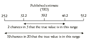 = (RSE%/100) x estimate = 0.179 x 39,200 = 7,000 (rounded to the nearest 100) 8 Therefore, there are about two chances in three that the value that would have been produced if all dwellings had been included in the survey will fall within the range 32,200 to 46,200 and about 19 chances in 20 that the value will fall within the range 25,200 to 53,200. This example is illustrated in the following diagram. Proportions and percentages 9 Proportions and percentages formed from the ratio of two estimates are also subject to sampling errors. The size of the error depends on the accuracy of both the numerator and the denominator. A formula to approximate the RSEs of proportions not provided in the spreadsheets is given below. This formula is only valid when x is a subset of y. 10 Considering table T2, of the 284,300 females who experienced a work-related injury or illness in the last 12 months, 130,300 or 45.8% worked part-time in the job where the work-related injury or illness occurred. The RSE of 130,300 is 8.9% and the RSE for 284,300 is 7.1%. Applying the above formula, the RSE for the proportion of females who worked part-time hours in job where most recent work-related injury or illness occurred is as follows. Please note, due to the Jackknife method of variance estimation being used to calculate the RSEs reported in the spreadsheet attachments to this publication (including some proportions), the method of estimation used below will result in slightly different RSEs compared with those RSEs reported in the spreadsheets. 11 Therefore, the SE for the proportion of the 284,300 females who experienced a work-related injury or illness, who worked part-time hours in the job where the work-related injury or illness occurred is 2.5 percentage points (= 45.8/100 x 5.4). Therefore, there are about two chances in three that the proportion of females who experienced a work-related injury or illness who worked part time is between 43.3% and 48.3%, and 19 chances in 20 that the proportion is within the range 40.8% and 50.8%. Sums or Differences between estimates 12 Published estimates may also be used to calculate the sum of, or difference between, two survey estimates (of numbers, rates or percentages) where these are not provided in the spreadsheets. Such estimates are also subject to sampling error. 13 The sampling error of the difference between two estimates depends on their SEs and the relationship (correlation) between them. An approximate SE of the difference between two estimates (x-y) may be calculated by the following formula: 14 The sampling error of the sum of two estimates is calculated in a similar way. An approximate SE of the sum of two estimates (x + y) may be calculated by the following formula: 15 An example follows. From paragraph 7 the estimated number of persons aged 15-19 who experienced a work-related injury or illness in the last 12 months is 39,200 and the SE is 7,000. From table T1, the estimate of persons aged 20-24 who experienced a work-related injury or illness in the last 12 months is 85,200 and the SE is 9,800. The estimate of persons aged 15-24 who experienced a work-related injury or illness in the last 12 months is: 39,200 + 85,200 = 124,400 16 The SE of the estimate of persons aged 15-24 who experienced a work-related injury or illness in the last 12 months is: 17 Therefore, there are about two chances in three that the value that would have been produced if all dwellings had been included in the survey will fall within the range 112,400 to 136,400 and about 19 chances in 20 that the value will fall within the range 100,400 to 148,400. 18 While this formula will only be exact for sums of, or differences between, separate and uncorrelated characteristics or subpopulations, it is expected to provide a good approximation for all sums or differences likely to be of interest in this publication. SELECTED ESTIMATES AND RSES