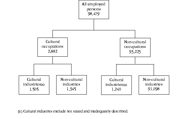 The following diagram illustrates ways in which people can be 'culturally' employed. They can either work in a cultural occupation in a cultural industry; in a cultural occupation but not in a cultural industry; or in a non-cultural occupation but in a cultural industry. In 2011, a considerable proportion of the people who were employed in a cultural occupation worked in a non-cultural industry (47% or 1,345). A librarian employed in a university is an example of a cultural occupation within a non-cultural industry.