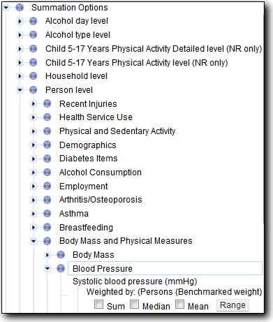 TableBuilder will apply 'Persons (Benchmarked weight)' by default. Using Weights The NATSIHS is a sample survey. To produce estimates for the in-scope population you must use weight fields in your tables. The weight fields are listed below. In TableBuilder they can be found under the Summation Options category in the left hand pane under the applicable level. If you do not select a weight field, TableBuilder will use 'Persons (Benchmarked weight)' by default. This will give you estimates of the number of persons. To produce estimates of the number of households you would have to add 'Household (Benchmarked weight)' from the Household level to your table. The Household Weight is stored on the Household Level while the Person Weight is stored on the Person level. When using a Weight/Summation from a level that is different to that of the variables in the table please be careful in interpreting the results.