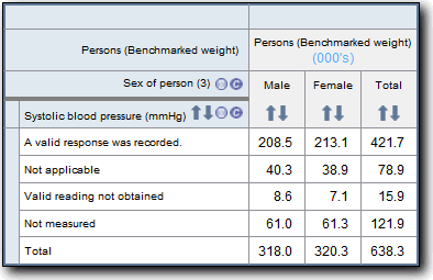 This document was added or updated on 14/08/2015. USING THE TABLEBUILDER ...and the Summation Options. The following table shows the responses for 'Systolic Blood Pressure' by 'Sex of person' using the version in the Person folder. The continuous values of the data item are contained in the 'A valid response was recorded' row. If the actual continuous values are to be displayed then it is necessary to use the Summation Option version and create a range for them. Here is the same table with a range applied for the continuous values of 'Systolic Blood Pressure (mmHG)' (called 'Systolic ranged'). Note that the numbers of respondents for the other responses 'Not applicable', 'Valid reading not obtained' and 'Not measured' no longer contribute to the table. Any special codes for continuous data items are listed in the Data Item List. Continuous items can be used to create custom categories in 'My Custom Data' by first ranging the item. For example, to create five year age groupings for 'Age first told had diabetes or high sugar levels' this can be done by ranging the item with a five year increments from Summation Options. However to deviate from groupings of equal increments, this must be done in 'My Custom Data'. As age is a continuous item, for deviations from equal increments, it must first be ranged (for example in one year increments) and then this ranged item can be grouped under the 'My Custom Data' tab to form unique age categories. For more information see the 'My Custom Data' section of the User Manual: TableBuilder, Jun 2013 (cat. no. 1406.0.55.005). CONFIDENTIALITY FEATURES IN TABLEBUILDER In accordance with the Census and Statistics Act 1905, all the data in TableBuilder are subjected to a confidentiality process before release. This confidentiality process is undertaken to avoid releasing information that may allow the identification of particular individuals, families, households, dwellings or businesses. Processes used in TableBuilder to confidentialise records include the following: Perturbation Effects To minimise the risk of identifying individuals in aggregate statistics, a technique is used to randomly adjust cell values. This technique is called perturbation. Perturbation involves small random adjustments of the statistics and is considered the most satisfactory technique for avoiding the release of identifiable statistics while maximising the range of information that can be released. These adjustments have a negligible impact on the underlying pattern of the statistics. The introduction of these random adjustments result in tables not adding up. While some datasets apply a technique called additivity to give internally consistent results, additivity has not been implemented on this TableBuilder. As a result, randomly adjusted individual cells will be consistent across tables, but the totals in any table will not be the sum of the individual cell values. The size of the difference between summed cells and the relevant total will generally be very small. Please be aware that the effects of perturbing the data may result in components being larger than their totals. This includes determining proportions. Table suppression Some tables generated within TableBuilder may contain a substantial proportion of very low counts within cells (excluding cells that have counts of zero). When this occurs, all values within the table are suppressed in order to preserve confidentiality. The following error message below is displayed at the bottom of the table when table suppression has occurred. ERROR: The table has been suppressed as it is too sparse ERROR: table cell values have been suppressed Field exclusion rules Certain groups of similar variables are restricted from being used together in a table. These restrictions are referred to as field exclusion rules, and are in place in order to protect confidentiality. The collections of similar variables restricted in this way are called field exclusion groups. For the Australian Aboriginal and Torres Strait Islander Health Survey there is one field exclusion group. This consists of the 2011 geographical and Socio-Economic Indexes for Areas (SEIFA) data items (see below for items). Only one data item from this group may be used in a single table. The geographic exception to this is the State or Territory item, which can be used in addition to one item from this group. Items included in the field exclusion group are: 2011 Geographic Items