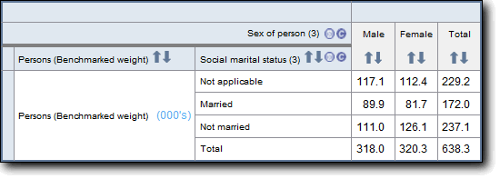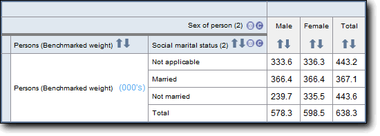 MEANS AND MEDIANS Means, medians and sums of continuous data items are calculated at the level of the continuous data item. A weight is automatically applied from a weight allocated behind the scenes to the level of the variable. For all levels, other than Household and Persons in household level, a person weight has been applied to each record (e.g. alcohol record) on the level based on the weight allocated to selected persons on the Person level. For Persons in household, the household weight has been applied to each person in the household. Due to current functionality of the software, a weight from another level cannot be brought into such calculations. The "subject" of means, medians and sums calculated in TableBuilder is therefore the statistical unit associated with the level of the database on which the continuous data item is stored. For example, the mean of the "Total volume of pure alcohol" data item at the Alcohol Day level would give the mean total volume of pure alcohol per alcohol day while the mean of the "Total volume of pure alcohol" data item at the Alcohol Type level would be the mean total volume of pure alcohol per alcohol type. The weights used for these calculations on levels are not visible, other than the Household and Persons levels, but are referenced in the 'Weighted by' statement with continuous variables, as per: ITEMS LOCATED ON MULTIPLE LEVELS Where items are available on more than one level, an additional number is added to the label to indicate the level version. For example a (1) indicates it's a Household level version, a (2) indicates a Persons in household level version, a (3) indicates a Person level version, and so on. These are identified in the Data item list labelling as well as the item in TableBuilder. The numbering is based on the ordering of levels found in the File Structure page of this product. Care should be used to ensure the correct version of the item is used, particularly with regards to demographic items located on both the Persons in household and Person levels. See below for more details. PERSONS IN HOUSEHOLD LEVEL VERSUS PERSON LEVEL VARIABLES The Persons in Household level contains data for every person in the household while the Persons level only contains data for the selected persons. Both levels are children of the Household level - that is, they are siblings and are not linked by person but by household (see the File Structure page in this product or Structure of the TableBuilder section above for further information on structure). This means that there is a many-to-many link between records at these levels (persons on the Person level are linked to all the people in their household on the Persons in household level). When summing the Person weight (which is stored at the Person level) the meaning of the estimates produced when disaggregating by another data item at the Person level will not be the same as the meaning of the estimates produced when disaggregating by a data item at the Persons in Household level. For example, disaggregating by Sex and Marital status at the Person level will produce estimates of the type "Number of persons who are Male and Married". These estimates will be additive (aside from the effects of perturbation) as shown below. On the other hand, disaggregating by Sex and Marital status at the Persons in Household level, and using the Persons (Benchmarked weight) from the Person level, will produce estimates of the type "Number of persons in households containing one or more persons who are Male and Married". These estimates will usually not be additive as shown below. Document Selection These documents will be presented in a new window.