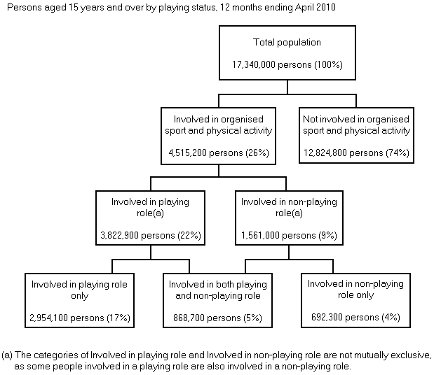 In the 12 months prior to interview, an estimated 4.5 million people aged 15 years and over (26%) reported that they were involved in organised sport and physical activity. This included 3.8 million people involved in playing roles (22% of persons aged 15 years and over), and 1.6 million people involved in non-playing roles (9%). Of the 1.6 million people with a non-playing role, 56% also had a playing role (Table 1).