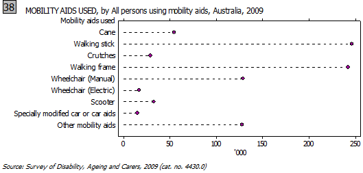 There has been an increase in the proportion of people with disabilities using aids to assist with their mobility between 2003 (13%) and 2009 (15%) (Graph 38).