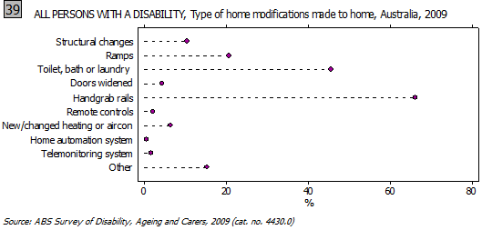 The proportion of people with disabilities who have made modifications to their homes because of their conditions has increased slightly between 2003 and 2009, from 11%-12%. The most common modification made was the addition of handgrab rails, followed by modifications to toilets, bathrooms and/or laundries (Graph 39).