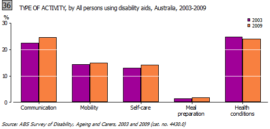 Looking at the use of aids in relation to specific activities, the largest increase in usage has occurred in the area of communication aids. There has been a 2.0 percentage point increase in the proportion of people with disabilities using communication aids between 2003 and 2009. The increase appears to be the result of more people using hearing aids and cochlear implants, with other types of communication aids either dropping in use or being used at the same rate. Mobile or cordless phones are also being used more commonly to assist people with their disability, with the texting capability of phones improving the capability of people with hearing problems to communicate.