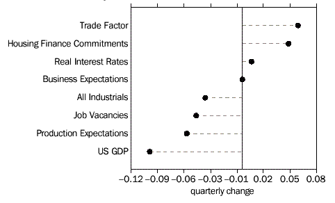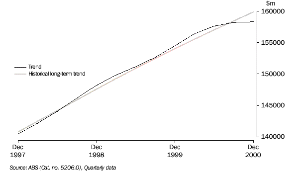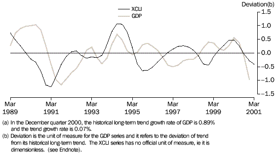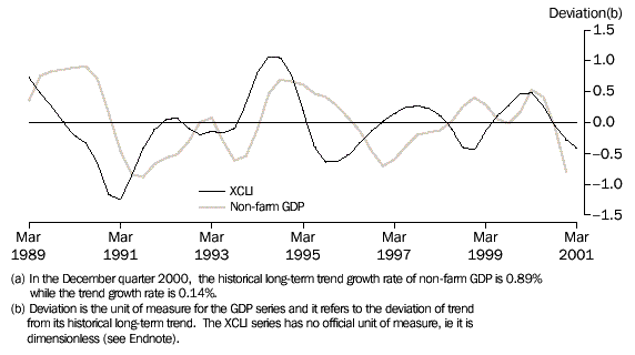 There was a significant turnaround of 0.14 in the contribution of the secured housing finance commitments component to the change in the XCLI between the September quarter 2000 and March quarter 2001, from -0.09 in the September quarter 2000 to 0.05 in the March quarter 2001. Following the weak original GDP data for the December quarter 2000, the growth of the GDP trend was slower over the second half of 2000 but was still positive-from a high of 1.26% in the March quarter 2000 to a low of 0.07% in the December quarter 2000. The growth of the historical long-term trend continued to decelerate and was 0.89% in the December quarter 2000, which is to be expected given the recent decline in GDP trend. THE REFERENCE SERIES, GDP The reference or target series for the XCLI is the GDP business cycle in Australia. The business cycle of a series is defined as the deviation between the trend and the historical long-term trend in the series. Graph 1 shows the business cycles in GDP and the XCLI. Graph 2 shows the level of trend GDP compared with its historical long-term trend. AN ALTERNATIVE REFERENCE SERIES, NON-FARM GDP In the December quarter 1995, there was a peak in the business cycle which the XCLI failed to predict. This peak was largely attributable to the effects of a good farm season. The XCLI does not contain an indicator which leads first order farm product effects. In recognition of this, Graph 3 presents an alternative target series, namely, the business cycle of non-farm GDP, chain volume measure. The XCLI peaked in the March quarter 2000. Based on historical performance, the non-farm GDP business cycle may have been expected to peak two quarters later. However, after revisions of the GDP trend, the non-farm GDP business cycle also peaked in the March quarter 2000. 3. EXPERIMENTAL COMPOSITE LEADING INDICATOR (XCLI) AND, THE BUSINESS CYCLE IN NON-FARM GDP - Chain volume measure (reference year 1998-99)(a) ANALYSIS OF COMPONENT INDICATORS The XCLI summarises the business cycles present in a selection of economic indicators which had typically shown turning points ahead of the business cycle in GDP from the early 1970s to the early 1990s. Because the evolution of each expansion and contraction in activity presents a unique combination of features, none of the individual component indicators has had an unvarying or perfectly stable leading relationship with GDP. However, when combined to form the XCLI their performance as a group is more stable. In the March quarter 2001, four of the eight components made negative contributions to the quarterly change in the XCLI, three components made a positive contribution, while another made a negligible contribution (Table 2 and Graph 4). However, overall the XCLI was still negative although the rate of decline was less than in the previous quarter. Graphs 5 to 12 show each component’s trend and historical long-term trend. Negative contributions. The components making negative contributions to the quarterly change in the March quarter 2001 XCLI were the US GDP (-0.10, Graph 6), production expectations (-0.06, Graph 11), job vacancies (- 0.05, Graph 8), the All Industrials Index (-0.04, Graph 9) while business expectations made a negligible contribution (-0.00, Graph 12). Positive contributions. The components making positive contributions to the quarterly change in the March quarter 2001 XCLI were the trade factor (0.06, Graph 5), housing finance commitments (0.05, Graph 7) and the real interest rate component (0.01, Graph 10). 4. CONTRIBUTIONS TO QUARTERLY CHANGES IN THE XCLI TRADE FACTOR 5. TRADE FACTOR The trade factor is defined as the ratio between commodity prices in terms of Special Drawing Rights and the price index for imported materials used by Australian producers. This ratio gives an early indication of changes in the terms of trade. In the March quarter 2001, the trend of the trade factor continued to decline, although at a slower rate in comparison to its long-term trend. Therefore, given the position of the trend relative to its long-term trend and the trend’s slower negative growth, the trade factor component made a positive contribution (0.06) to the change in the XCLI in the March quarter 2001, the largest positive contribution of all its components. United States GDP In the March quarter 2001, the trend of the United States GDP continued to rise, although at a slower rate since the December quarter 1999. Further, the long-term trend also continued to increase in the March quarter 2001, although the rate of growth has decelerated since the June quarter 1998. The trend of the US GDP crossed below its long-term trend in the March quarter 2001 for the first time since the December quarter 1999. Therefore, the US GDP component made a negative contribution (-0.10) to the change in the XCLI in the March quarter 2001, the largest negative contribution of all its components. 6. UNITED STATES GDP, Chain volume measure (Reference year 1996) Secured housing finance commitments Following four quarters of decline, the trend of the secured housing finance commitments rose in the March quarter 2001. The historical long-term trend for secured housing finance commitments continued to rise in the December quarter 2000 although at a decelerating rate over the last three years. Since the trend grew faster than its long-term trend in the March quarter 2001, the secured housing finance commitments component contributed positively (0.05) to the change in the XCLI in the current quarter, following a neglible contribution in the December quarter 2000 and three strong negative contributions in the previous three quarters. 7. SECURED HOUSING FINANCE COMMITMENTS Job Vacancies Note that the job vacancies series are referenced to the middle month of a quarter. Following downward revisions to the original job vacancies data in May, August and November, the trend of the number of job vacancies was revised. It is now shown as beginning a decline in May 2000, wh