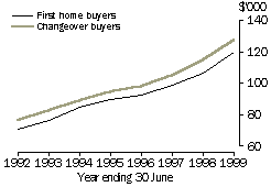 The average amount borrowed for home loans has increased steadily during the nineties, and at a faster rate than both house prices and household incomes. Between 1988-89 and 1998-99, the average loan size increased from 1.9 times to 2.8 times the average annual household income. Associated with their younger age profile and lower average incomes, first home buyers borrowed less, on average, than changeover buyers. However the rate of increase in average loan size was similar for both groups.