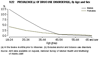 The 1997 National Survey of Mental Health and Wellbeing of Adults showed that the prevalence of drug use disorders declined steadily with age. For instance, 12% of males and 4% of females aged between 18 and 24 years had a drug use disorder compared to only 1% of males and females in the 45 to 54 year age group (graph 9.22). This was similar to the pattern for the prevalence of harmful alcohol use and dependence, although alcohol use disorders occurred around twice as often as other drug use disorders. Married people were less likely to have alcohol or other drug disorders than those who were never married.