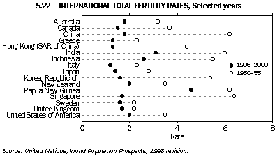 Over the past fifty years the total fertility rate has declined for most countries. Of the selected countries shown in graph 5.22, the total fertility rates of the Asian countries have shown the largest declines, Singapore declined at an annual average rate of 2.9% per annum, China by 2.7% and Viet Nam by 1.9% between 1950-1955 and 1995-2000.