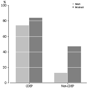 Hours of work As in the total Australian labour force, Indigenous men are more likely to work full-time (35 hours or more per week) than Indigenous women. 69% of Indigenous men worked full-time in 1994 compared to 46% of Indigenous women. This difference in the number of hours worked explains some of the difference in income between men and women (see Income of Indigenous people). Indigenous people employed in CDEP were more likely to be employed part-time than other employed Indigenous people. 74% of men and 84% of women employed in CDEP were employed on a part-time basis compared to 13% of men and 47% of women in non-CDEP employment. Of employed Indigenous people, 73% were satisfied with their working hours and 27% wanted to work more hours. The highest rate of employed people wanting to work more hours was in rural areas (35%). This contrasts with capital cities and other urban areas where 19% and 27% respectively wanted to work more hours. The dependence of rural communities on CDEP initiatives to provide employment coupled with the high levels of part-time employment provided by CDEP are key factors in the high rate of rural people wanting to work more hours. PROPORTION OF INDIGENOUS PEOPLE EMPLOYED PART-TIME(a), 1994 (a) Expressed as a proportion of those employed in CDEP or non-CDEP.Source: National Aboriginal and Torres Strait Islander Survey, 1994 (unpublished data) EMPLOYED INDIGENOUS PEOPLE WANTING TO WORK MORE HOURS, 1994