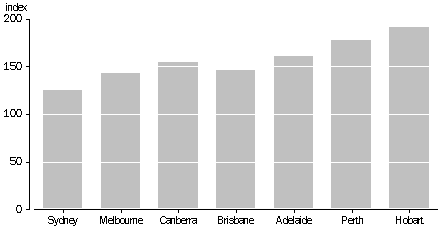 The national picture given by the affordability index, however, masks differences in the index across capital cities. For the financial year ending June 1993, the index showed accessibility of housing greatest in Hobart and Perth and least in Sydney. Comparing it to the moving annual median prices of established houses in June 1993, housing affordability varied between capital cities according to house prices, since interest rates remained comparable between States and Territories. Sydney had the highest house prices and the lowest affordability index. In contrast Hobart house prices were the lowest of all capital cities and, accordingly, the housing affordability index was the highest.