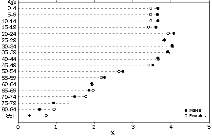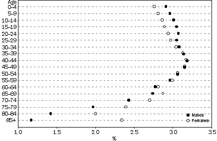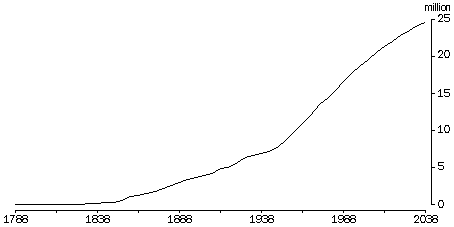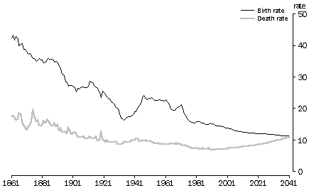 Source: Australian Demographic Trends (cat. no. 3102.0) The early decades (1901-1945) From the turn of the century until World War I (1901-1913) the average annual growth rate was high at 2.3%. This was due to a high birth rate, and high net overseas migration in the latter part of the period. In 1911, the year of Australia's first national census, Australia had a young population whose age-sex profile had been formed by a long period of high fertility and high mortality. Almost 12% of the population were under 5, and only 4% were aged 65 or over. The median age was 24 years. During World War I, disruptions to civilian migration caused a decline in net migration. Growth from natural increase also declined steadily, from 1.8% in 1914 to 1.1% in 1919. This was due to a fall in the crude birth rate, and a rise in the crude death rate. Average annual population growth rates fell from 2.3% in the period 1901-13 to 1.4% in the period 1914-1919. Growth rates recovered in the post-war period, despite a fall in the crude birth rate. Annual growth rates averaged 2.1% in the 1920s. The increase in growth rates during this period was associated with increasing levels of migration to Australia following World War I. The economic collapse in 1929 and the depression during the 1930s led to a sharp decline in growth rates, falling to an average of 0.9% in the period 1930-1938. This decline in growth was associated with low levels of net migration, and a sharp decline in the crude birth rate. This fell to 16.4 per 1,000 population in 1934, the lowest rate recorded up to that point in the century. It did not fall to this level again until 1976. The rate of growth from natural increase fell to 0.7% in 1934 and 1935, the lowest rate recorded this century. During World War II annual growth rates remained relatively low, averaging 1.0% for the period 1939-1945. While the crude birth rate increased during the war years and the population grew through natural increase, growth through net migration was low. ACTUAL AND PROJECTED POPULATION Source: Australian Demography; Australian Demographic Statistics (cat. no. 3102.0); Projections of the Populations of Australia, States and Territories 1993 to 2041: Series A (cat. no. 3222.0) COMPONENTS OF POPULATION GROWTH Source: Australian Demography; Australian Demographic Statistics (cat. no. 3101.0); Australian Demographic Trends (cat. no. 3102.0); Projections of the Populations of Australia, States and Territories 1993 to 2041: Series A (cat. no. 3222.0) The post-war period (1946-1960) The post-war period from 1946-1960 saw high annual growth rates averaging 2.7% per year. Migration was an important component of this growth with the government actively encouraging migration to boost Australia's population. During this period net overseas migration added 1.2 million people to the population, many of them Europeans displaced by World War II. 43% of this increase occurred during the four years from 1949-1952. Despite the high contribution of net migration, most of the growth during this period was due to natural increase, the well-documented 'baby boom'. This could more appropriately be termed a 'marriage boom'. A greater proportion of the population married and had children, and women were starting and completing their childbearing earlier2. The proportion of women aged 15 and over who had ever married increased from 64% in 1921 to 79% in 1961 (see Australian Social Trends 1995, Trends in marriage and divorce). Despite individual women having fewer children, a large number of children were born during this period because an increasing proportion of women had children (see Trends in fertility). CRUDE BIRTH AND DEATH RATES(a) (a) Rates per 1,000 population. Source: Australian Demography; Australian Demographic Statistics (cat. no. 3101.0); Australian Demographic Trends (cat. no. 3102.0); Projections of the Populations of Australia, States and Territories 1993 to 2041: Series A (cat. no. 3222.0) The sixties and seventies (1961-1980) Population growth remained relatively high during the 1960s, averaging 2.1% per year. Rates of natural increase and net overseas migration eased back slightly from the high levels of the post-war period. Part of the decline in natural increase is attributed to the availability of oral contraception from 1961. Growth rates fell sharply in the first half of the 1970s, from a peak of 2.1% in 1970 to 1.0% in 1975. The average annual growth rate for the 1970s was 1.5%. Levels of net migration declined as the economy slowed and employment opportunities contracted. During the same period there was a decline in fertility. By the end of the 1970s fertility levels were even lower than those during the great depression, and were below replacement level (the fertility level required for a population to replace itself without immigration in the long-term). This decline was associated with social and economic developments, including higher levels of education and increasing numbers of women entering the labour force. Mortality rates were also falling, although at an insufficient pace to offset the fall in fertility, leading to a fall in growth due to natural increase from 1.2% in 1970 to 0.8% in 1980. Recent developments (1981-1994) Australia's population increased from 15.1 million at the end of 1981 to 18.1 million in June 1995. Average annual growth rates declined in this period, falling from 1.7% in 1981 to 1.0% in 1994. Australia's average annual growth rate for the period 1990-95 of 1.2% was lower than the world average annual rate over this period (1.6%), but similar to the rates of a number of other countries such as the USA, New Zealand, China, Singapore and Thailand5. The rate of growth due to natural increase continued to decline between 1981 and 1994, with fertility remaining below replacement level and death rates declining at almost all ages. The rate of growth due to net migration fluctuated considerably during this period, recording some of the