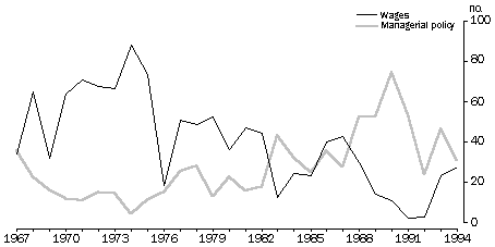 Data on causes of industrial disputes only refer to the main cause of a dispute. Therefore the relative importance of all causes as perceived by both employers and employees may not be reflected. Between 1967 and 1994 managerial policy and wages together were the causes of most industrial disputes ending in a year and accounted for at least half of the working days lost. In 1967, managerial policy was the major cause of industrial disputes (572), followed by wages (316) and physical working conditions (200). In 1994, these causes were also the top three with managerial policy accounting for 317 disputes, wages accounting for 66 and physical working conditions for 61.