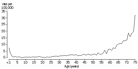 Source: Australian Institute of Health and Welfare (unpublished data); Estimated Resident Population by Sex and Age: States and Territories of Australia (cat. no. 3201.0). Current mortality, 1991-95 Of all deaths in the period 1991-95, 1% were due to infectious diseases. As with deaths from all causes, the risk of dying from infectious diseases was higher among infants in the first year of life (7 deaths per 100,000 infants) than for older children and adults aged up to their mid fifties, but increased rapidly among the elderly population. Death rates from infectious diseases were highest for septicaemia (2.6 per 100,000), viral hepatitis (0.6), and intestinal infections (0.4). However the risk of death from different types of infectious disease varied by age. Infants under one year who died from an infectious disease during the period 1991-95 were most likely to die from Meningococcal Infection (2.4 per 100,000 population), Intestinal Infection (1.4) or Septicaemia (0.9). The risk of dying from an infectious disease generally increased with age. Meningococcal infection was one exception to this pattern, with rates generally decreasing with age. The increase in risk with age was most evident for septicaemia. During the period 1991-95, the risk of a person aged 75 and over dying from septicaemia was 44 times higher than for infants in the first year of life, and 12 times higher than for adults aged 55-74. In contrast, the risk of people aged 75 and over dying from viral hepatitis was 12 times higher than an infant dying of this disease, and much the same as for people aged 55-74. Some population groups experience deaths at rates much higher than the national average. In 1995, age-standardised death rates from infectious diseases were four times higher for Indigenous people than for the total population3. AGE-STANDARDISED DEATH RATES(a) FROM INFECTIOUS DISEASES (a) Standardised death rate per 100 000 of the 1991 population (see p. 42 for explanation of age standardisation). Source: Australian Institute of Health and Welfare (unpublished data); Estimated Resident Population by Sex and Age: States and Territories of Australia (cat. no. 3201.0). Notifiable diseases Notification of many infectious diseases to State and Territory health authorities is required to identify, prevent and control outbreaks4. The Communicable Diseases Network - Australia New Zealand, collates national data on notifications of infectious diseases. Notifications data need to be interpreted with caution, because not all diseases are notifiable in each State and Territory. Furthermore, owing to under-reporting, notifications are likely to underestimate the actual incidence (that is, the number of new cases each year) of disease. Despite these limitations, notifications data are the best available estimates of the incidence of various infectious diseases. AGE-SPECIFIC DEATH RATES(a) FROM INFECTIOUS DISEASES, 1991-95 (a) Rate per 100,000 population aged 0-75. Source: Causes of Death, Australia (cat. no. 3303.0 and unpublished data); Estimated Resident Population by Sex and Age: States and Territories of Australia (cat. no. 3201.0). Intestinal infections Diarrhoea is the most common symptom of intestinal tract infections and is caused by a range of different organisms. However, because it is usually in a mild form, people do not always seek medical attention, and it is often unreported. Worldwide, diarrhoea remains one of the most important causes of ill-health and death among infants and children. In developed countries the incidence is much lower, but still significant. Better hygiene and clean water, as well as increased rates of breastfeeding have all contributed to the decline in the incidence of diarrhoeal disease among infants in Australia. Because many intestinal infections are transmitted through food, the quality of food production and distribution is an important aspect of prevention. AGE-SPECIFIC DEATH RATES(a), 1991-95