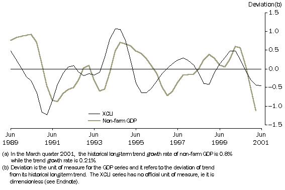 THE REFERENCE SERIES, GDP The reference or target series for the XCLI is the GDP business cycle in Australia. The business cycle of a series is defined as the deviation between the trend and the historical long-term trend in the series. Graph 1 shows the business cycles in GDP and the XCLI. Graph 2 shows the level of trend GDP compared with its historical long-term trend. When the trend is below the historical long term trend the GDP deviation from trend shown in Graph 1 is negative. AN ALTERNATIVE REFERENCE SERIES, NON-FARM GDP In the December quarter 1995, there was a peak in the business cycle which the XCLI failed to predict. This peak was largely attributable to the effects of a good farm season. The XCLI does not contain an indicator which leads first order farm product effects. In recognition of this, Graph 3 presents an alternative target series, namely, the business cycle of non-farm GDP, chain volume measure. The XCLI peaked in the March quarter 2000. Based on historical performance, the non-farm GDP business cycle may have been expected to peak two quarters later. However, the non-farm GDP business cycle also peaked in the March quarter 2000. 3. EXPERIMENTAL COMPOSITE LEADING INDICATOR (XCLI) AND, THE BUSINESS CYCLE IN NON-FARM GDP- Chain volume measure (reference year 1998-99)(a) ANALYSIS OF COMPONENT INDICATORS The XCLI summarises the business cycles present in a selection of economic indicators which had typically shown turning points ahead of the business cycle in GDP from the early 1970s to the early 1990s. Because the evolution of each expansion and contraction in activity presents a unique combination of features, none of the individual component indicators has had an unvarying or perfectly stable leading relationship with GDP. However, when combined to form the XCLI their performance as a group is more stable. In the June quarter 2001, three of the eight components made negative contributions to the quarterly change in the XCLI, three components made a positive contribution, while two made negligible contributions (Table 2 and Graph 4). Overall, the change in the XCLI was still negative although the rate of decline was less than in the previous quarter. Graphs 5 to 12 show each component’s trend and historical long-term trend. Negative contributions. The components making significant negative contributions to the quarterly change in the June quarter 2001 XCLI were job vacancies (-0.14, Graph 8), US GDP (-0.09, Graph 6) and the production expectations (-0.05, Graph 11). Positive contributions. The components making positive contributions to the quarterly change in the June quarter 2001 XCLI were housing finance commitments (0.16, Graph 7), trade factor (0.09, Graph 5) and business expectations (0.03, Graph 12). The real interest rate component (0.00, Graph 10) and the All Industrials Index (-0.01, Graph 9) made negligible contributions. 4. CONTRIBUTIONS TO QUARTERLY CHANGES IN THE XCLI Trade factor The trade factor is defined as the ratio between commodity prices in terms of Special Drawing Rights and the price index for imported materials used by Australian producers. This ratio gives an early indication of changes in the terms of trade. In the June quarter 2001, the trend of the trade factor showed a small rise, while the long-term trend continued to decline. Therefore, the trade factor component made a positive contribution (0.09) to the change in the XCLI in the June quarter 2001. 5. TRADE FACTOR United States GDP In the June quarter 2001, the trend of the United States GDP continued to rise, although at a slower rate than the long-term trend. Therefore, the US GDP component made a negative contribution (-0.09) to the change in the XCLI in the June quarter 2001. The rate of growth of the long term trend has decelerated since the June quarter 1998. The trend of the US GDP crossed below its long-term trend in the December quarter 2000, for the first time since the December quarter 1999. 6. UNITED STATES GDP, Chain volume measure (Reference year 1996) Secured housing finance commitments The trend of the secured housing finance commitments continued to rise in the June quarter 2001. The historical long-term trend for secured housing finance commitments continued to rise in the December quarter 2000 although at a decelerating rate over the last three years. Since the trend grew faster than its long-term trend in the June quarter 2001, the secured housing finance commitments component contributed positively (0.16) to the change in the XCLI in the current quarter, following positive contributions in March Quarter 2001 (0.13) and the December Quarter 2000 (0.03). 7. SECURED HOUSING FINANCE COMMITMENTS Job Vacancies Note that the job vacancies series are referenced to the middle month of a quarter. The original job vacancies trend started to decline in November 2000, and has since continued to decline. It fell below its historical long-term trend in February 2001. In contrast, the historical long-term trend has been rising at a decelerating rate since May 1998. Job vacancies made the largest negative contribution (-0.14) to the change in the XCLI in the June quarter 2001. 8. JOB VACANCIES All Industrials index In the June quarter 2001, the trend of the All Industrials Index rose, but its historical long-term trend rose a little more strongly. Accordingly, in the June quarter 2001, the All Industrials Index made a negligible contribution (-0.01) to the change in the XCLI in the June quarter 2001. 9. ALL INDUSTRIALS INDEX Real interest rate The XCLI uses the inverse of the business cycle in the real interest rate, lagged four quarters. Therefore, it is the June quarter 2000 movement of the real interest rate that contributes to the June quarter 2001 movement in the XCLI. Following five quarters of negative contributions to the XCLI, the real interest rate component made a negligible contribution (0.00) to the change in the XCLI in the March and June quarters 2001 but it will