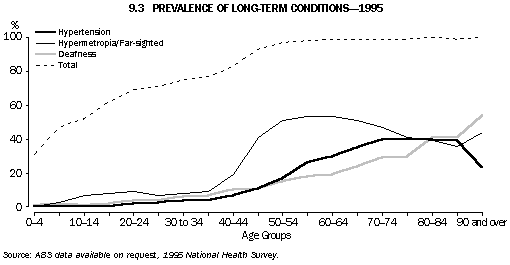 Females were more likely than males to experience long term conditions, partly due to their older age structure. The higher number of long term conditions reported by females may also reflect that women are more likely to consult health professionals, and hence have conditions diagnosed. The proportion of the population with any long term conditions increased with age, from 31% of 0-4 year olds to over 99% of people aged 60 years and over (graph 9.3). The prevalence of hypermetropia increased slowly with age to 10% of people aged 35-39, then increased strongly to over 50% of people aged 55-60 years. It remained at this level (approximately 50%) for people in their sixties until decreasing gradually to 40% of those aged 85-89 years. The prevalence of deafness in the community also increased with age; of those aged 90 years and over, 54% reported deafness as a long term condition, indicating that as people age their hearing abilities deteriorate. Factors such as the natural ageing process, as well as environmental exposure to noise, could explain this pattern. Age is also a major determining factor in the prevalence of hypertension. Less than 1% of the Australian population aged under 20 experienced hypertension, compared to over 39% of those aged 70 years and over. Mortality There were 128,102 deaths registered in 1999, consisting of 67,227 male and 60,875 female deaths.This represented an increase of 0.7% on the corresponding figure for 1998 (127,202 deaths). Malignant neoplasms and ischaemic heart diseases were the leading causes of death, accounting for 27% and 22% respectively of total deaths registered (table 9.4).